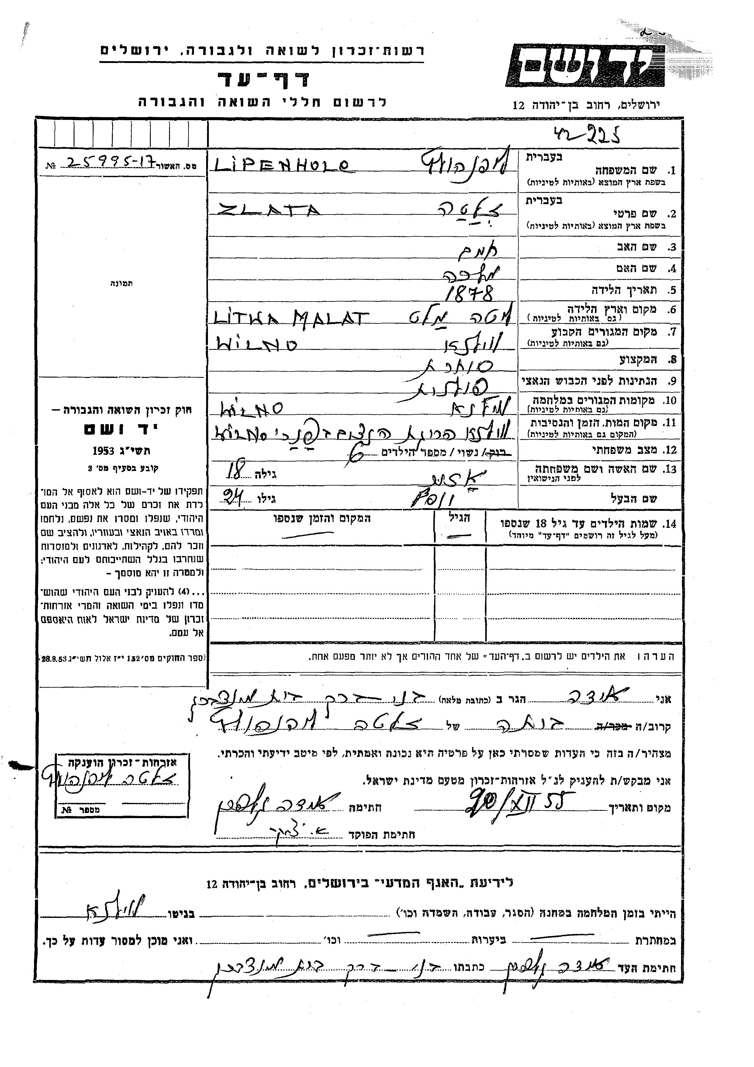 Zlata Lipenholc, geb. Azur wurde im Jahr 1878 in Malat, Litauen geboren. Sie war die Tochter von Khaim und Malka. Sie war Kaufmann/-frau und mit Yosef Verheiratet. Vor dem Zweiten Weltkrieg lebte sie in Wilno, Polen. Während des Krieges war sie in Wilno, Polen.