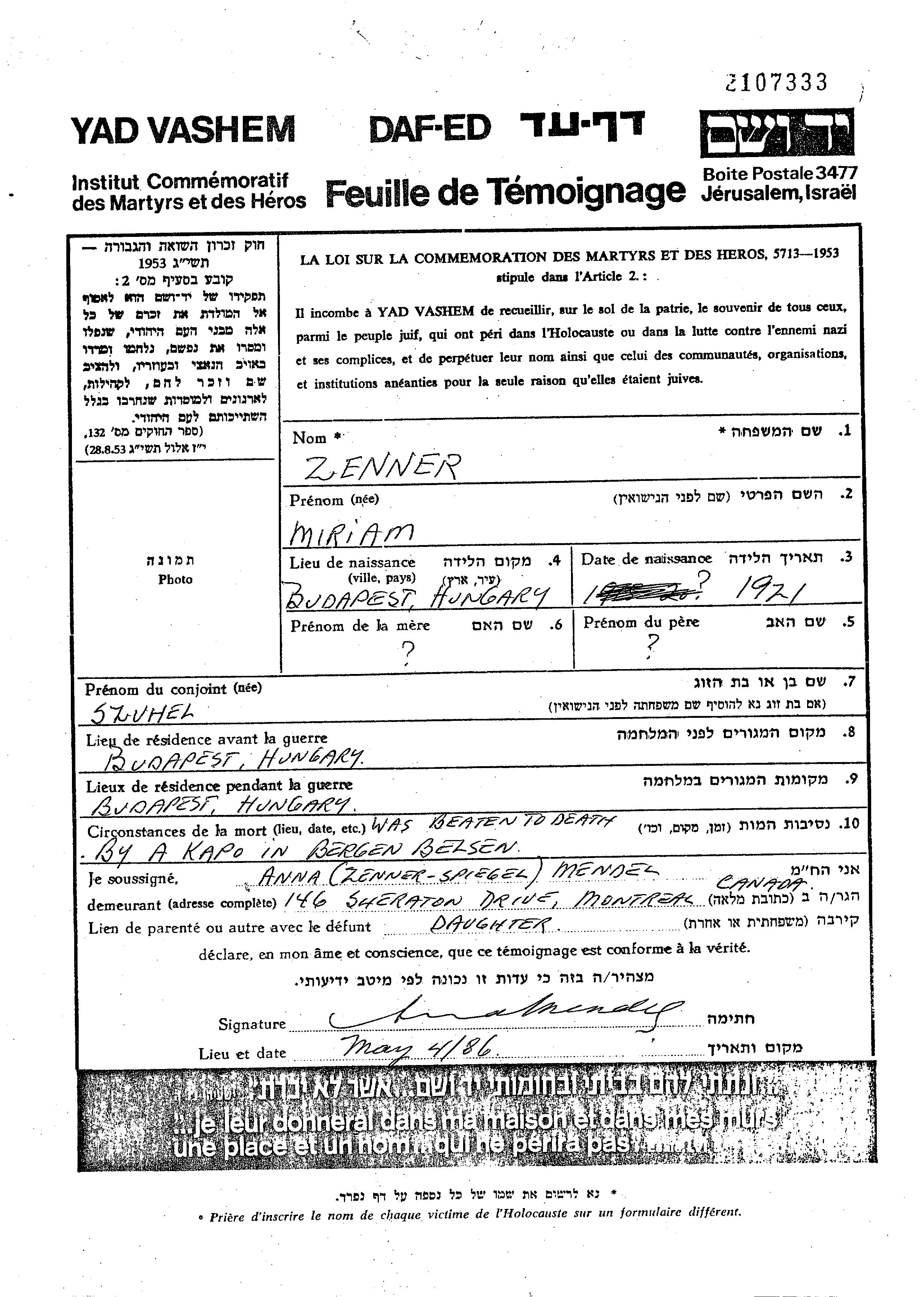 Miriam Zenner, geb. Szuhel Sol wurde im Jahr 1921 in Budapest, Ungarn geboren. Vor dem Zweiten Weltkrieg lebte sie in Budapest, Ungarn.