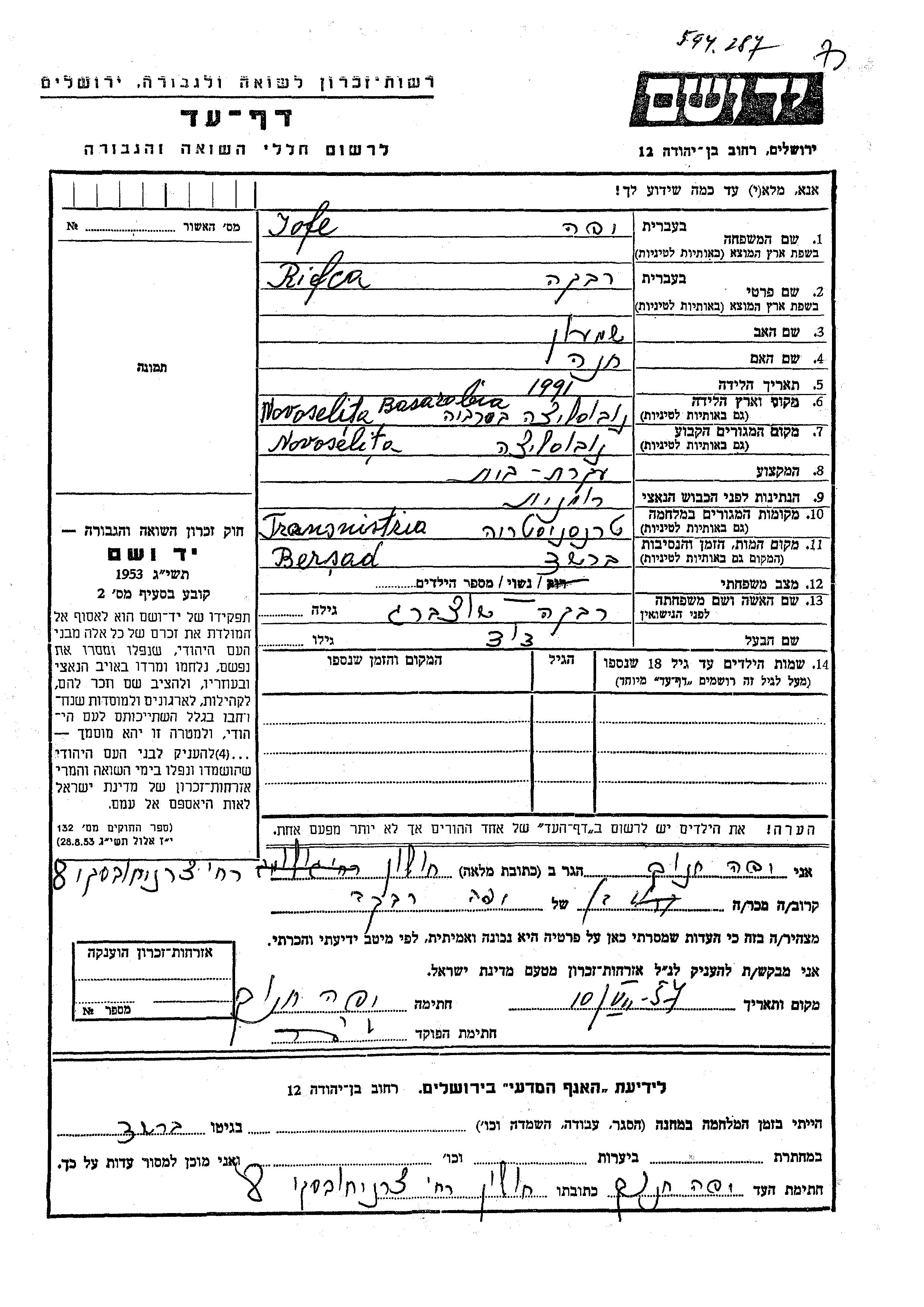 Rifca Jafe, geb. Shutzberg wurde im Jahr 1891 in Novoselitsa Town, Rumänien geboren. Sie war die Tochter von Shimon und Khana. Sie war Hausfrau und mit Rivka Verheiratet. Vor dem Zweiten Weltkrieg lebte sie in Novoselitsa Town, Rumänien. Während des Krieges war sie in Transnistria, Ukraine (UdSSR).