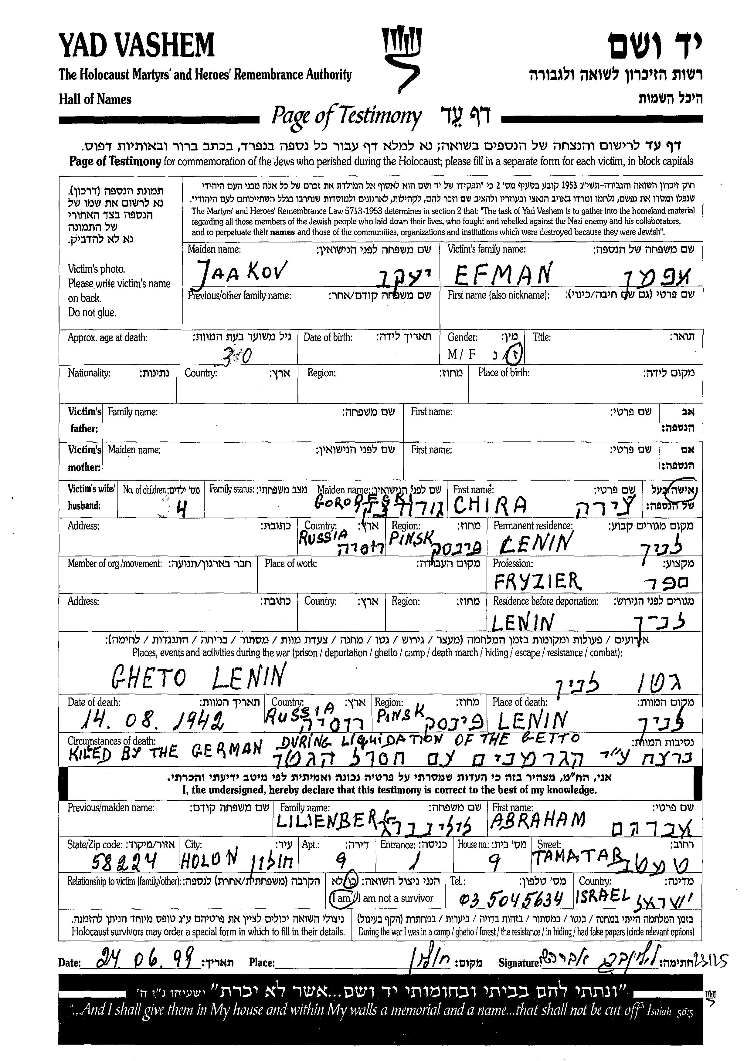 Yaakov wurde in der Schoah ermordet. Todesort: Lenin, Polen im Jahr 14/08/1942.