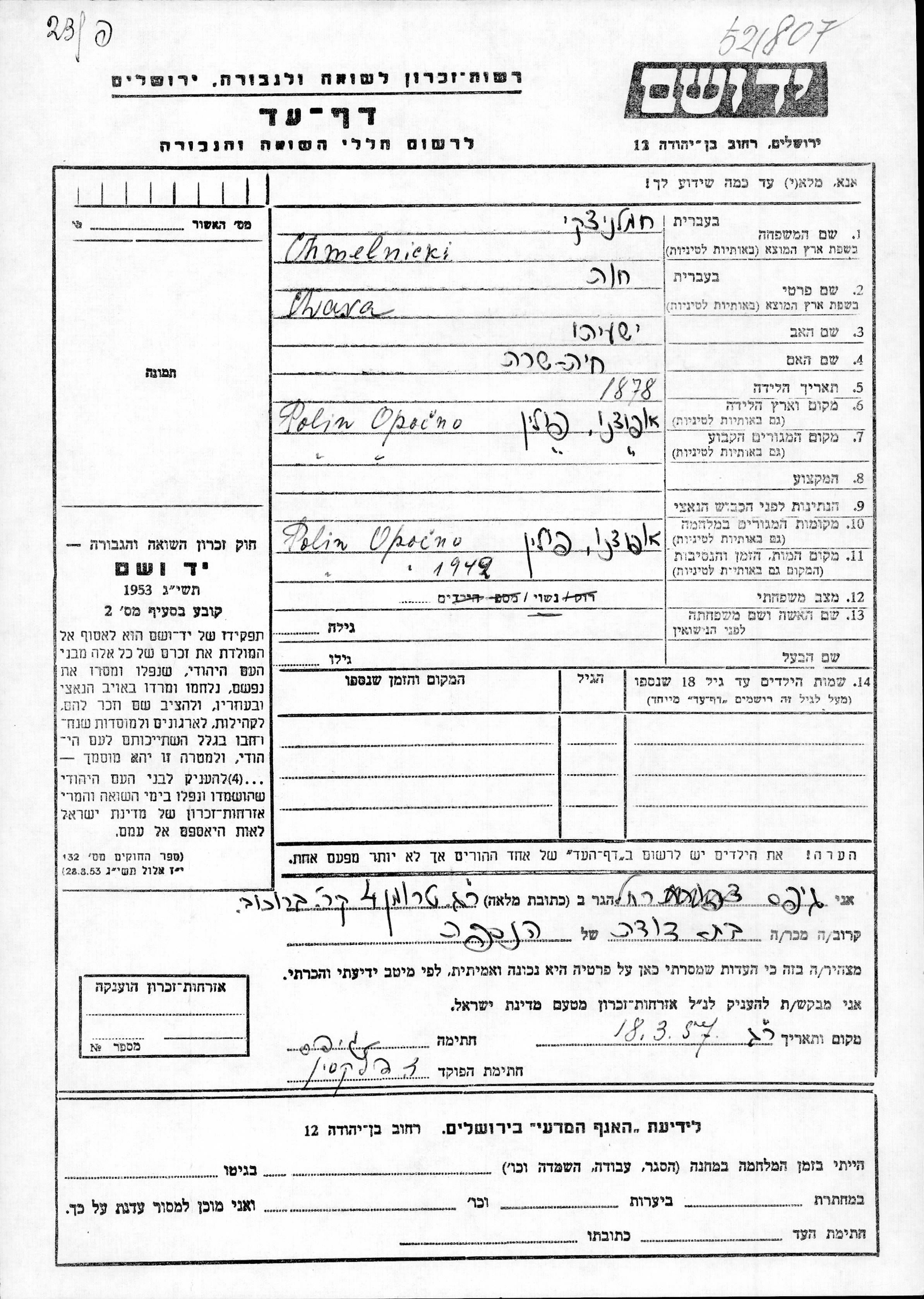 Chava Chmelnitzki wurde im Jahr 1878 in Opoczno, Polen geboren. Sie war die Tochter von Yeshayahu und Khaia Sara. Sie war Verheiratet. Vor dem Zweiten Weltkrieg lebte sie in Opoczno, Polen. Während des Krieges war sie in Opoczno, Polen.