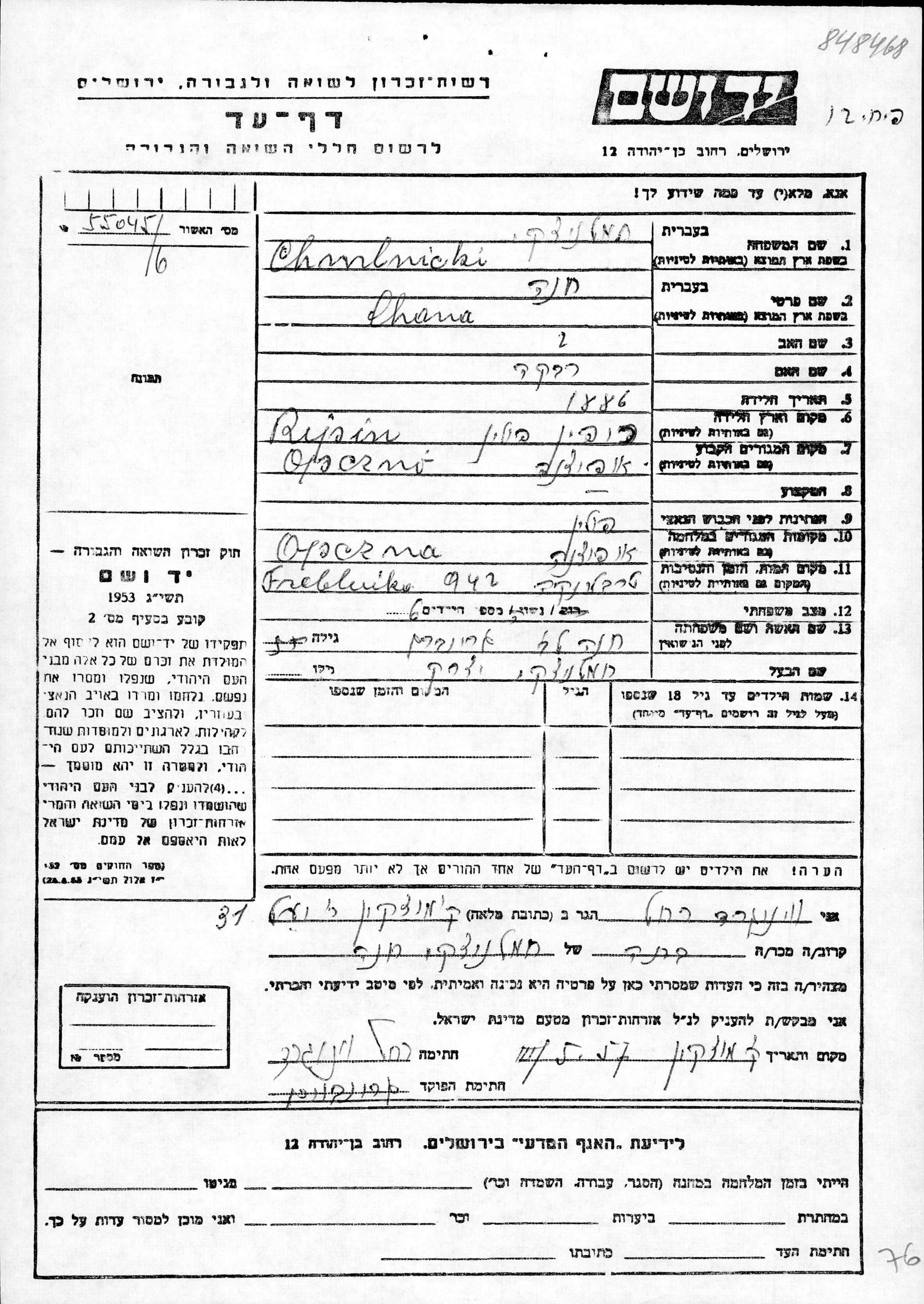 Chana Chmlnicki, geb. Grinberg wurde im Jahr 1886 in Ripin, Polen geboren. Sie war die Tochter von Rivka. Sie war mit Yitzkhak Verheiratet. Vor dem Zweiten Weltkrieg lebte sie in Opoczno, Polen. Während des Krieges war sie in Opoczno, Polen.