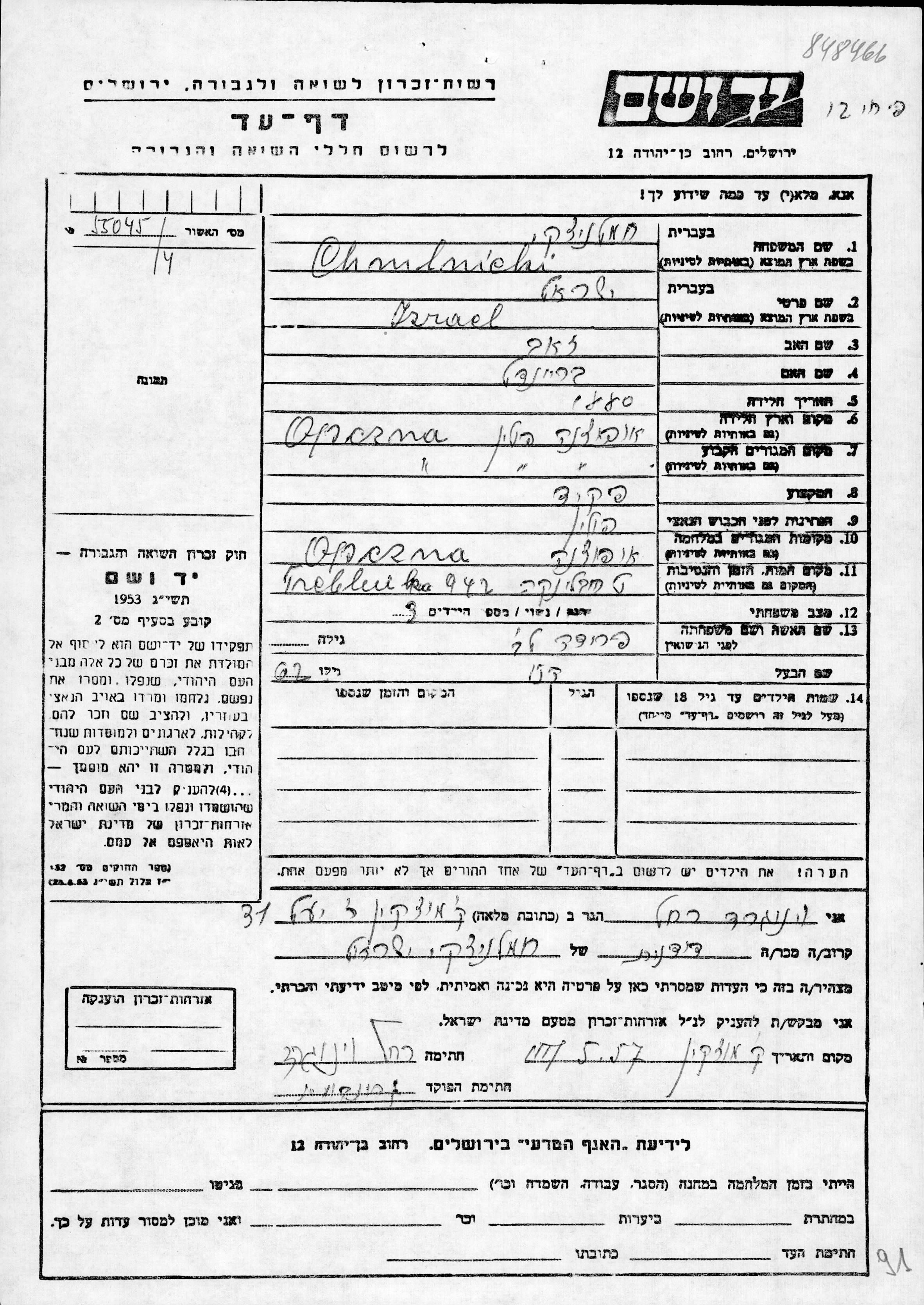 Izrael Chmlnicki wurde in Opoczna, Polen geboren. Er war der Sohn von Zeev und Braindel. Er war Angestellte/-r und mit Frida Verheiratet. Vor dem Zweiten Weltkrieg lebte er in Opoczna, Polen. Während des Krieges war er in Opoczna, Polen.