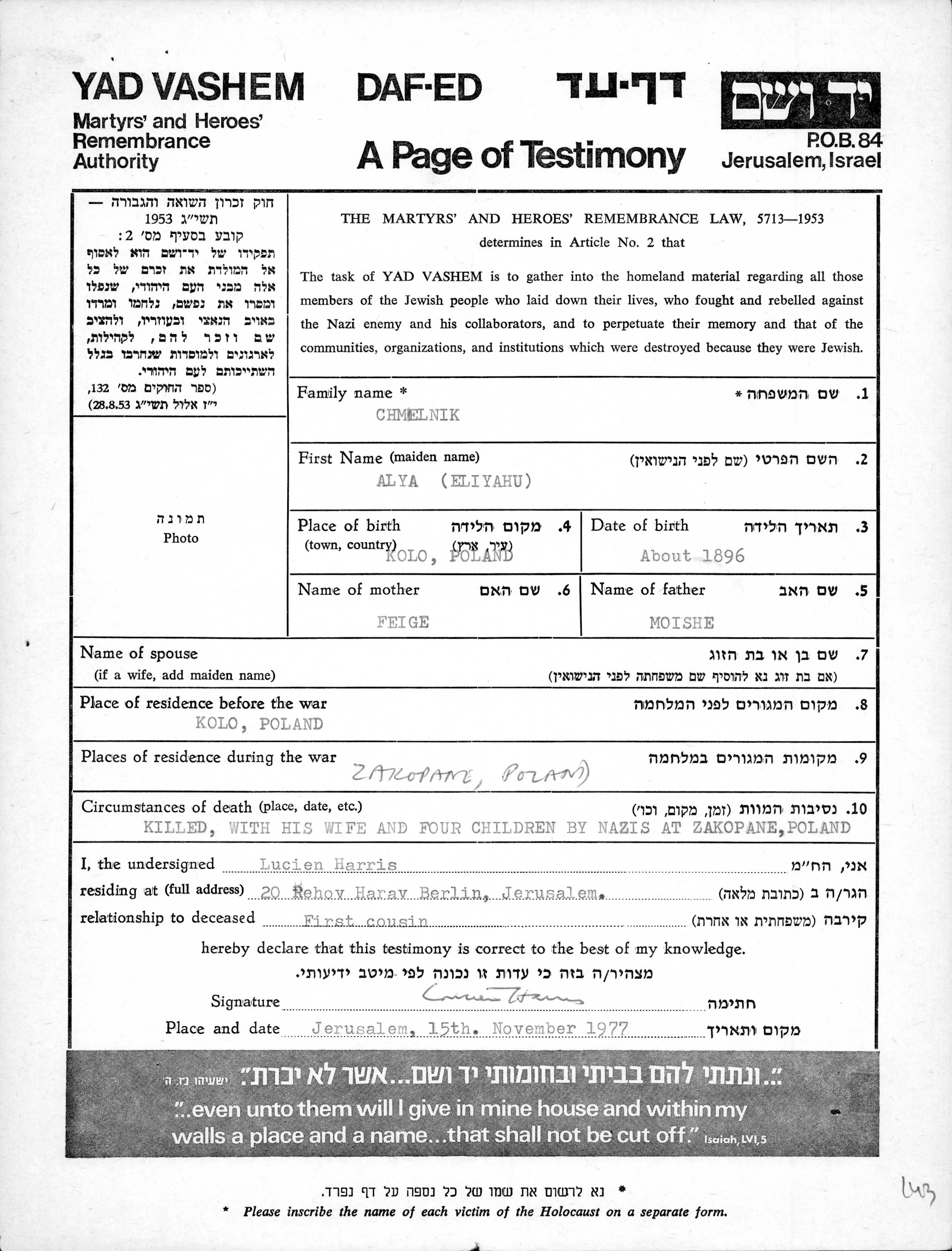 Alya Eliyahu Chmielnik wurde im Jahr 1896 in Kolo, Polen geboren. Er war der Sohn von Moishe und Feige. Er war Verheiratet. Vor dem Zweiten Weltkrieg lebte er in Kolo, Polen. Während des Krieges war er in Zakopane, Polen.