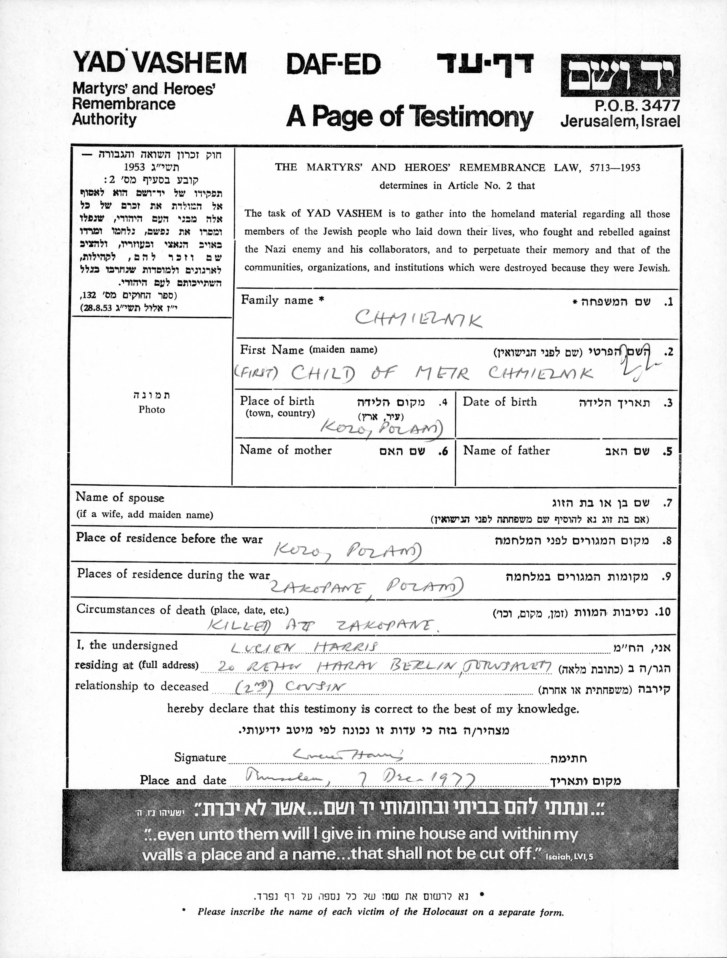 Vorname unbekannt Chmielnik wurde in Kolo, Polen geboren. Er/sie war der/ die Sohn/Tochter von Meir. Er/Sie war Kind. Vor dem Zweiten Weltkrieg er/sie in Kolo, Polen. Während des Krieges war er/sie in Zakopane, Polen.