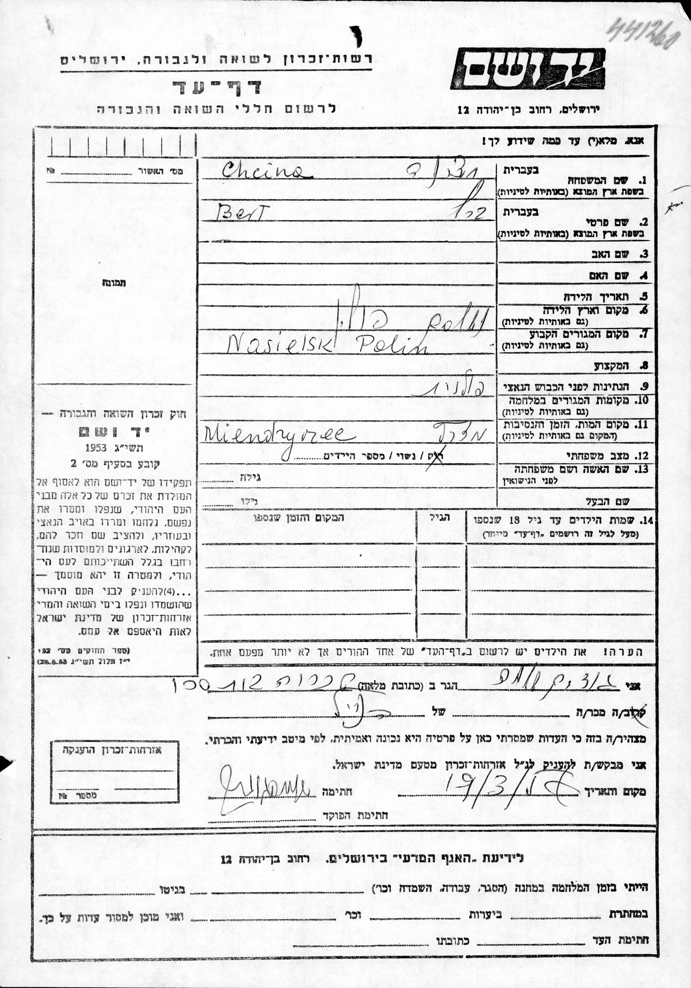 Bert Berl Chcina wurde in Nasielsk, Polen geboren. Er war Verheiratet. Vor dem Zweiten Weltkrieg lebte er in Nasielsk, Polen.