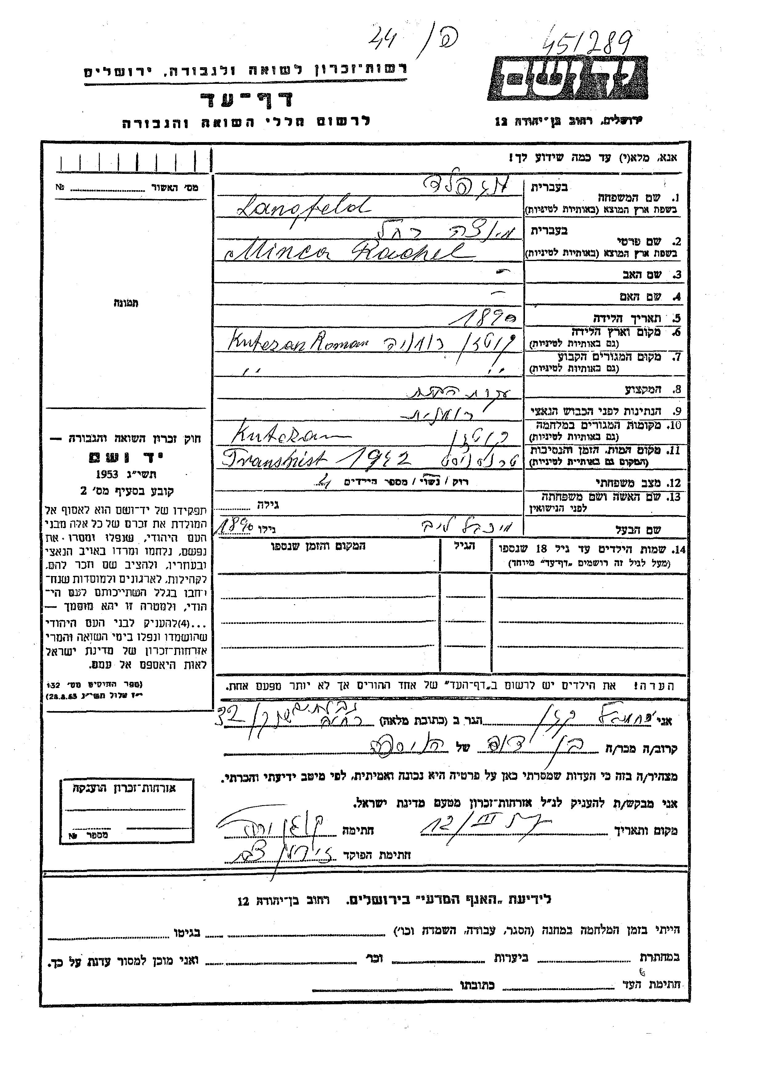 Minca Rachel Langfeld wurde im Jahr 1890 in Cotiugeni, Rumänien geboren. Sie war Hausfrau und mit Mikhael Leib Verheiratet. Vor dem Zweiten Weltkrieg lebte sie in Cotiugeni, Rumänien. Während des Krieges war sie in Cotiugeni, Rumänien.
