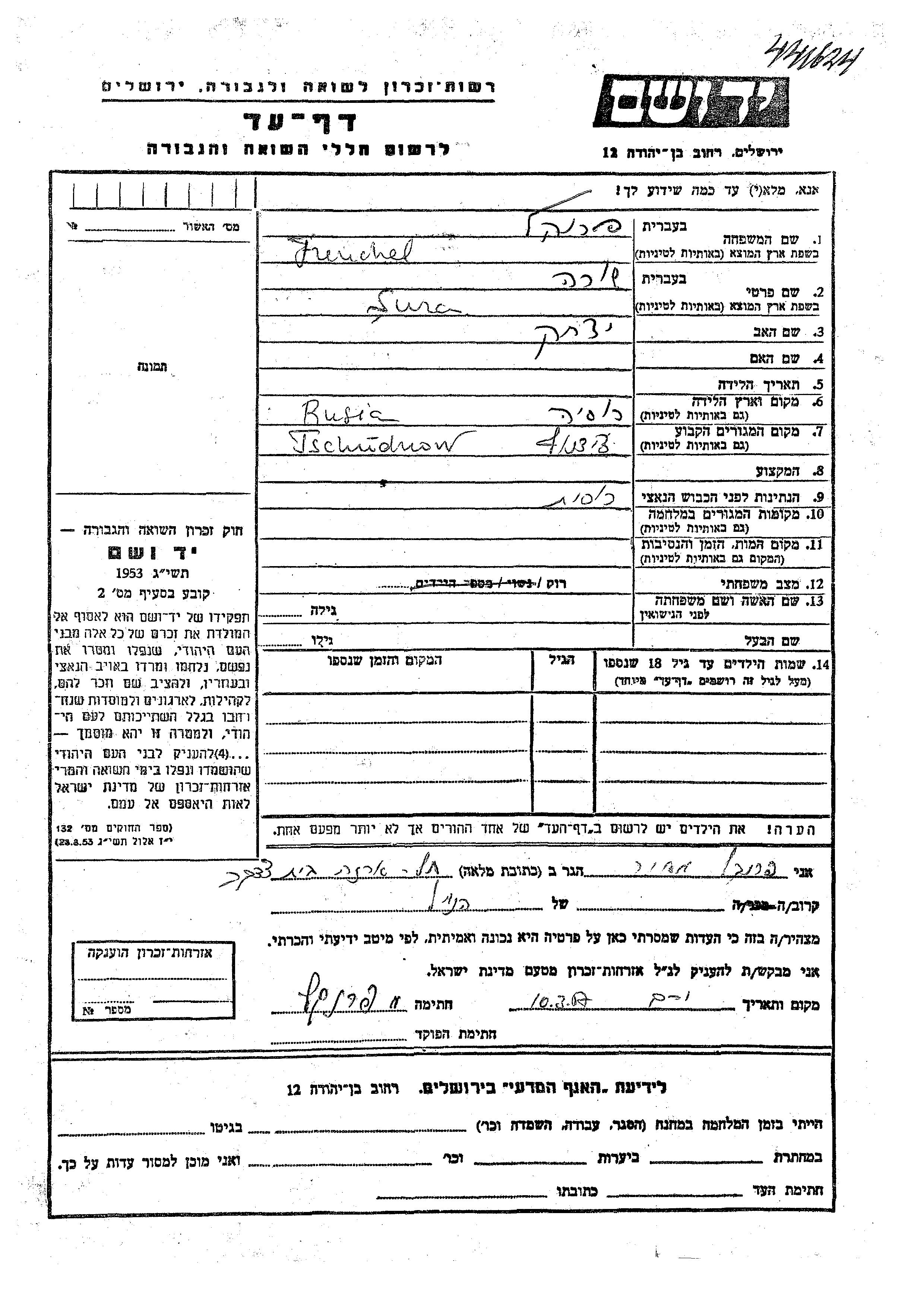 Sura Shura Frenchel wurde in Russland (UdSSR) geboren. Sie war die Tochter von Yitzkhak. Sie war Ledig. Vor dem Zweiten Weltkrieg lebte sie in Ciechanow, Polen.