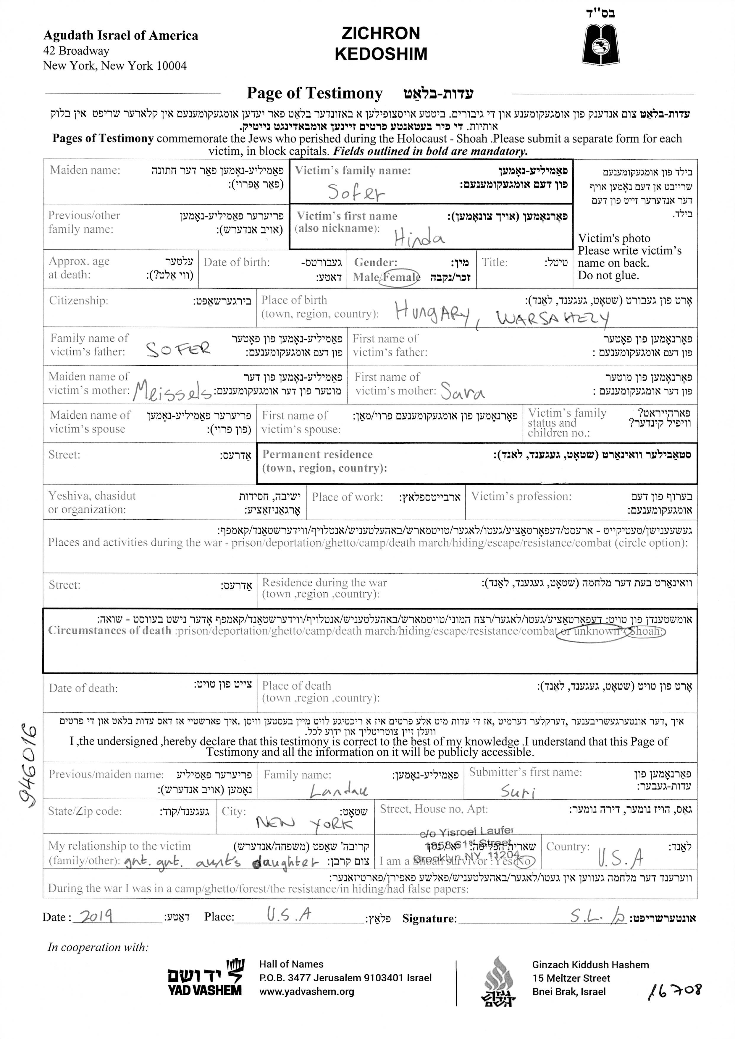 Hinda Sofer wurde in Vasarhely, Ungarn geboren. Sie war die Tochter von Sara, geb. Meissels.