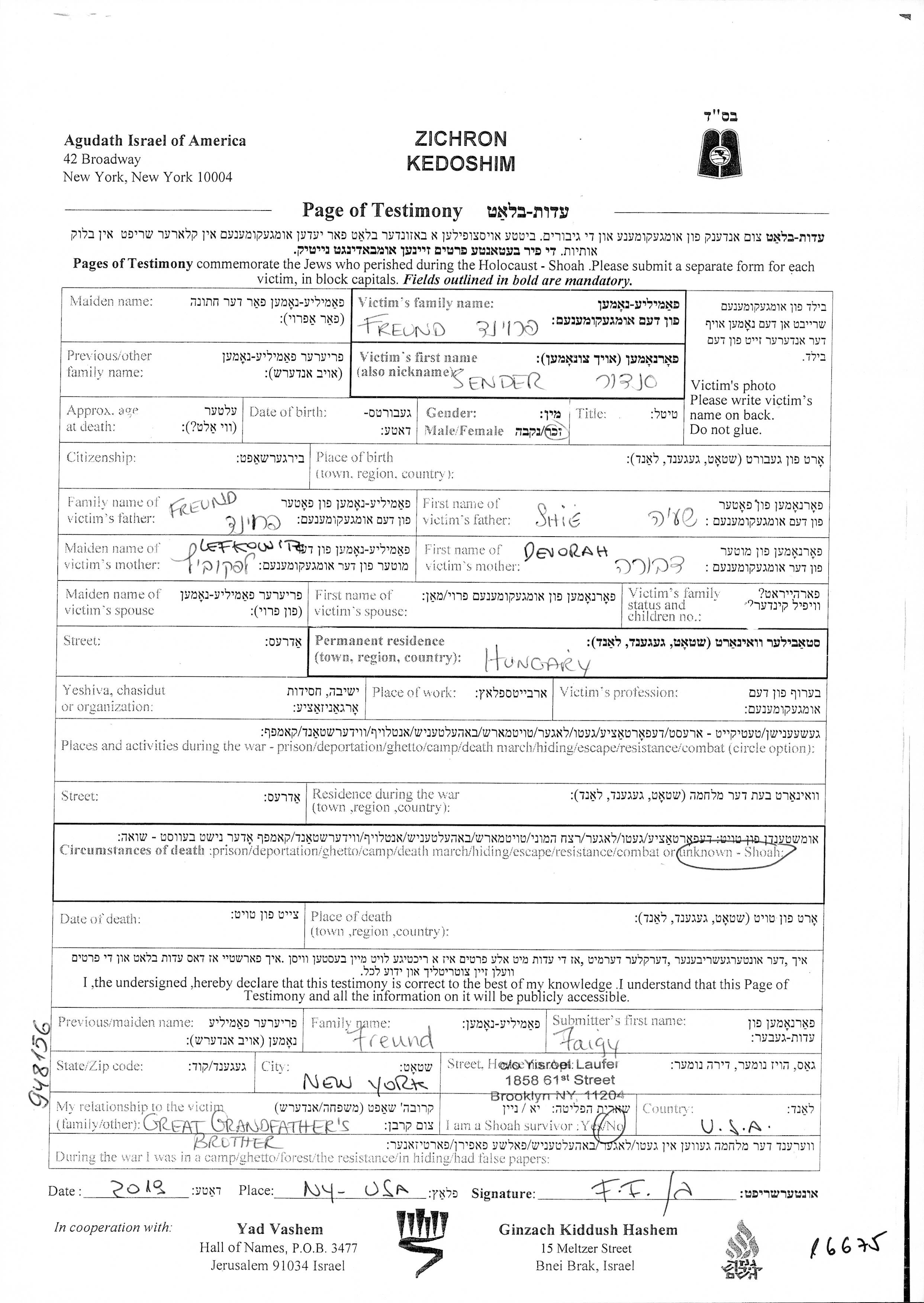 Sender Freund wurde Er war der Sohn von Shie Chaia und Devorah, geb. Lefkowitz. Vor dem Zweiten Weltkrieg lebte er in Ungarn.