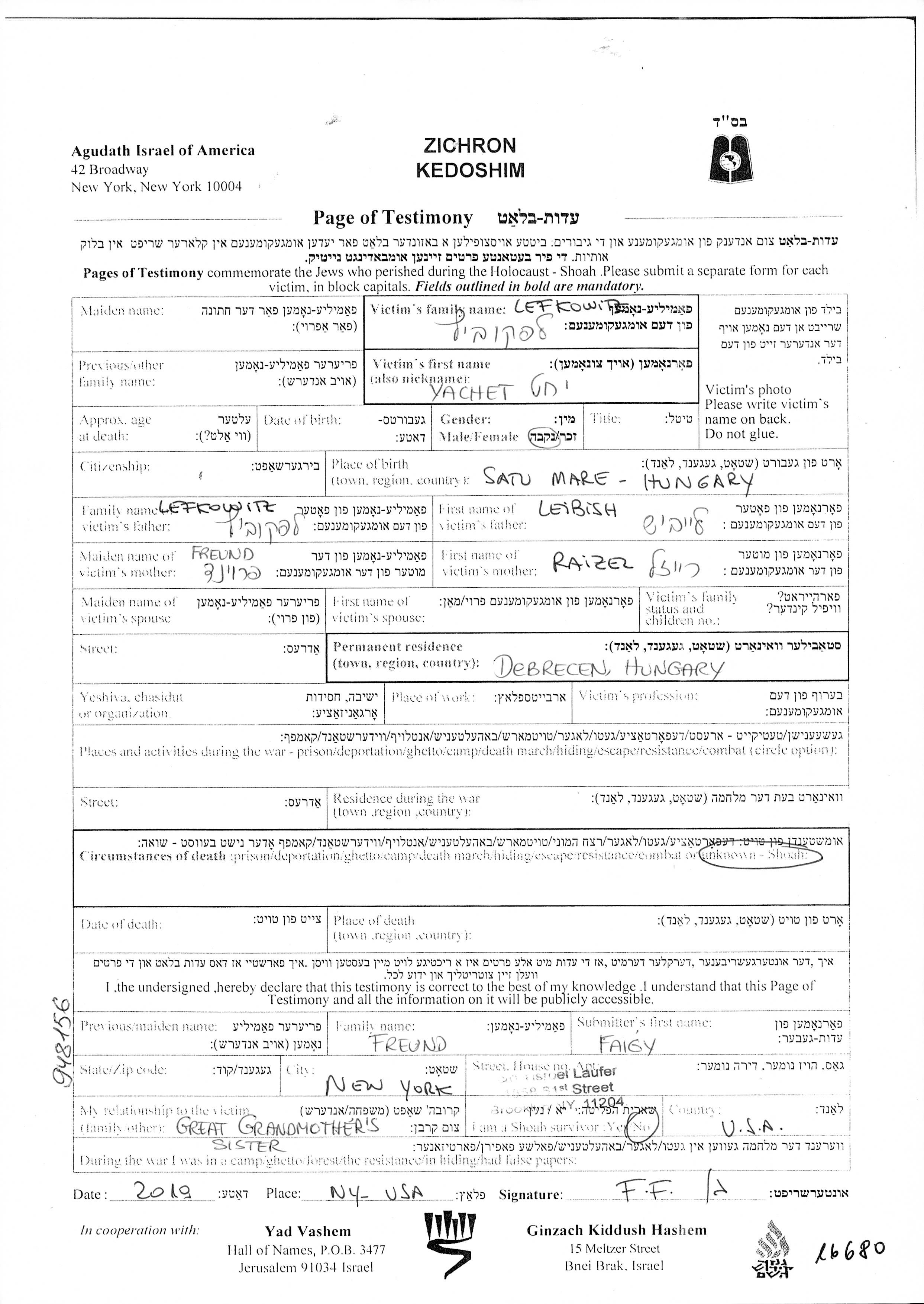 Lefkowitz Yachet Debrecen, Ungarn Gedenkblatt