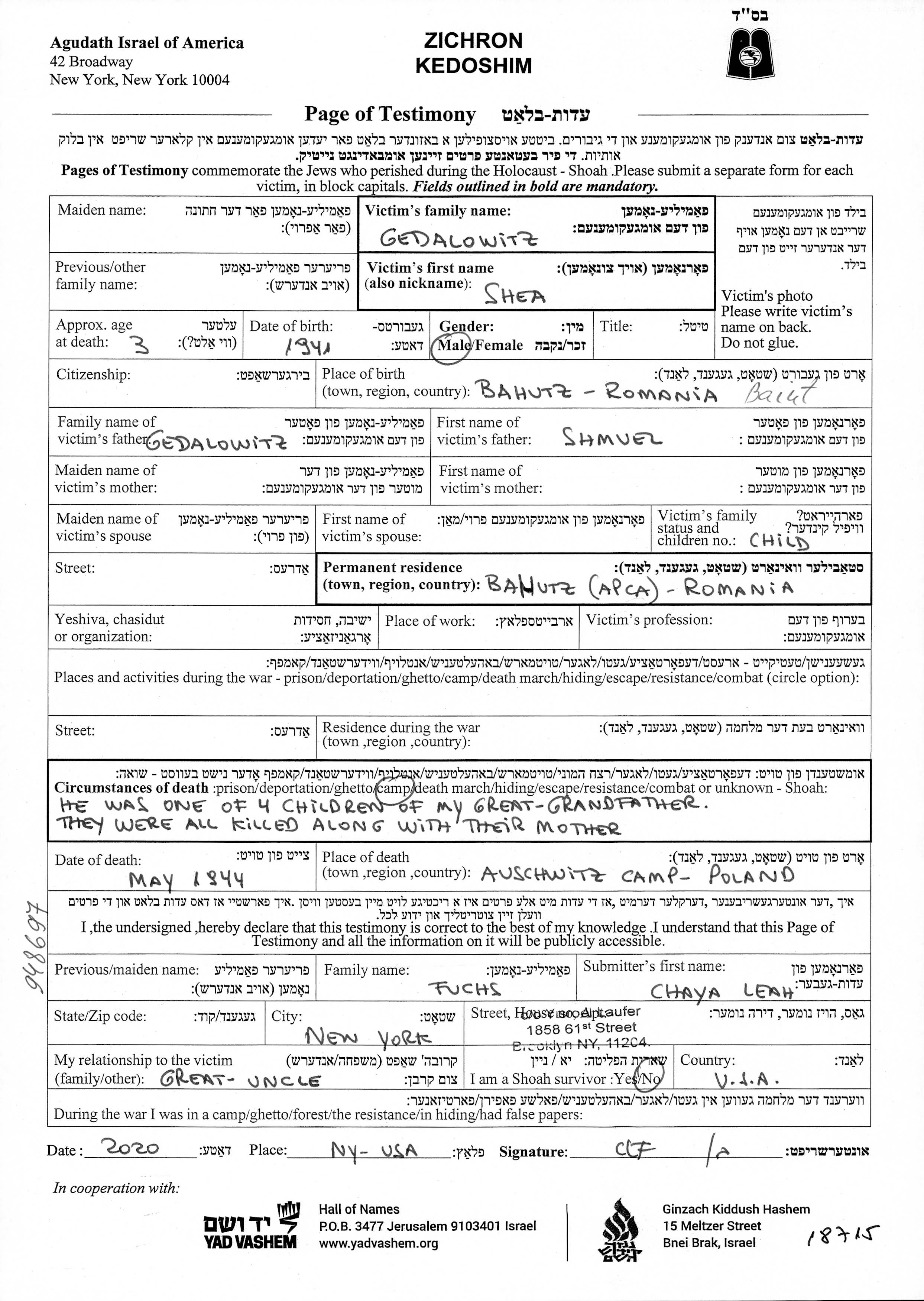 Shea Gedalowitz wurde im Jahr 1941 in Baiut, Rumänien geboren. Er war der Sohn von Shmuel. Er war Kind. Vor dem Zweiten Weltkrieg lebte er in Baiut, Rumänien. Während des Krieges war er in Auschwitz, Polen.