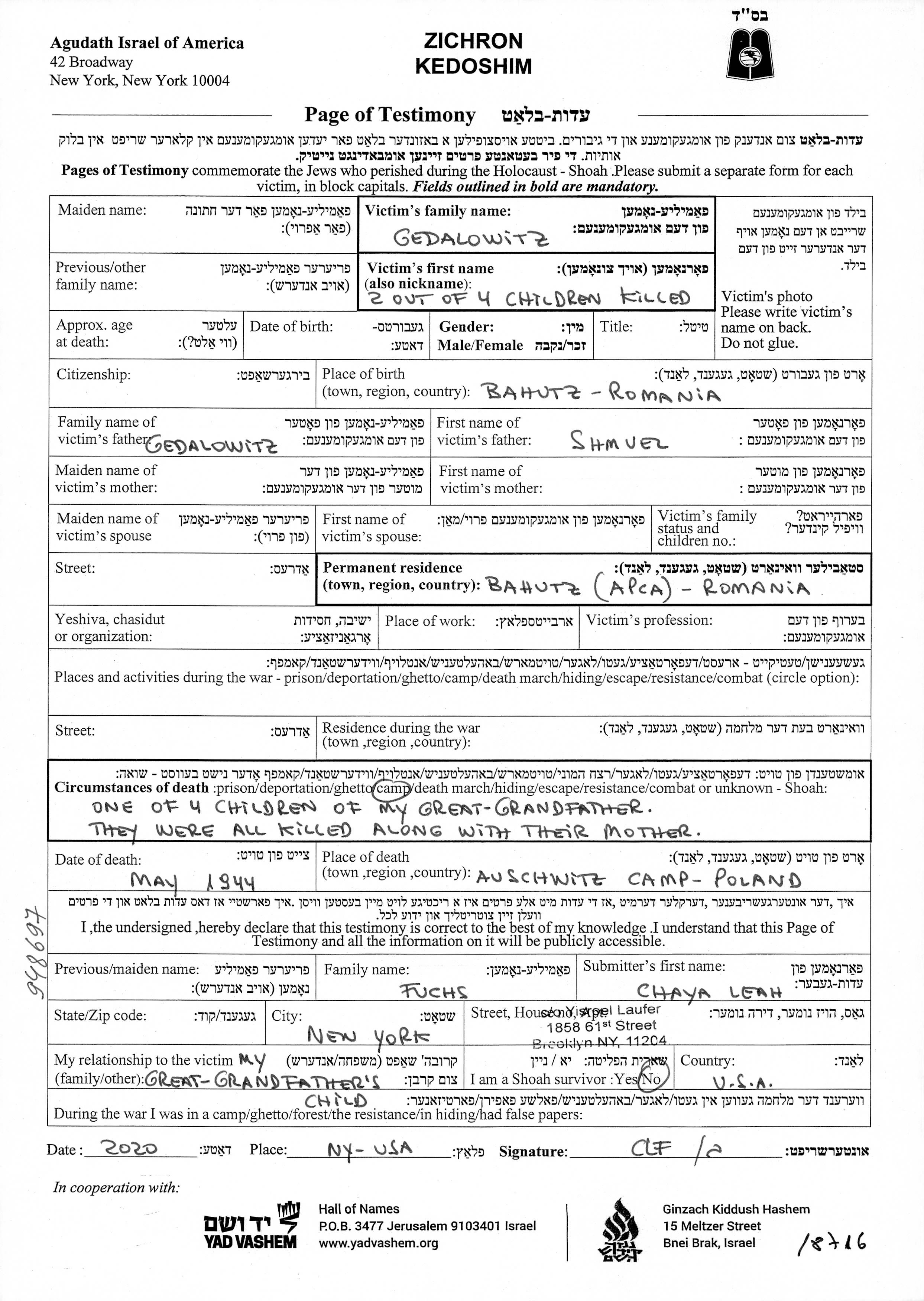 Vorname unbekannt Gedalowitz wurde in Baiut, Rumänien geboren. Er/sie war der/ die Sohn/Tochter von Shmuel. Vor dem Zweiten Weltkrieg er/sie in Baiut, Rumänien. Während des Krieges war er/sie in Auschwitz, Polen.
