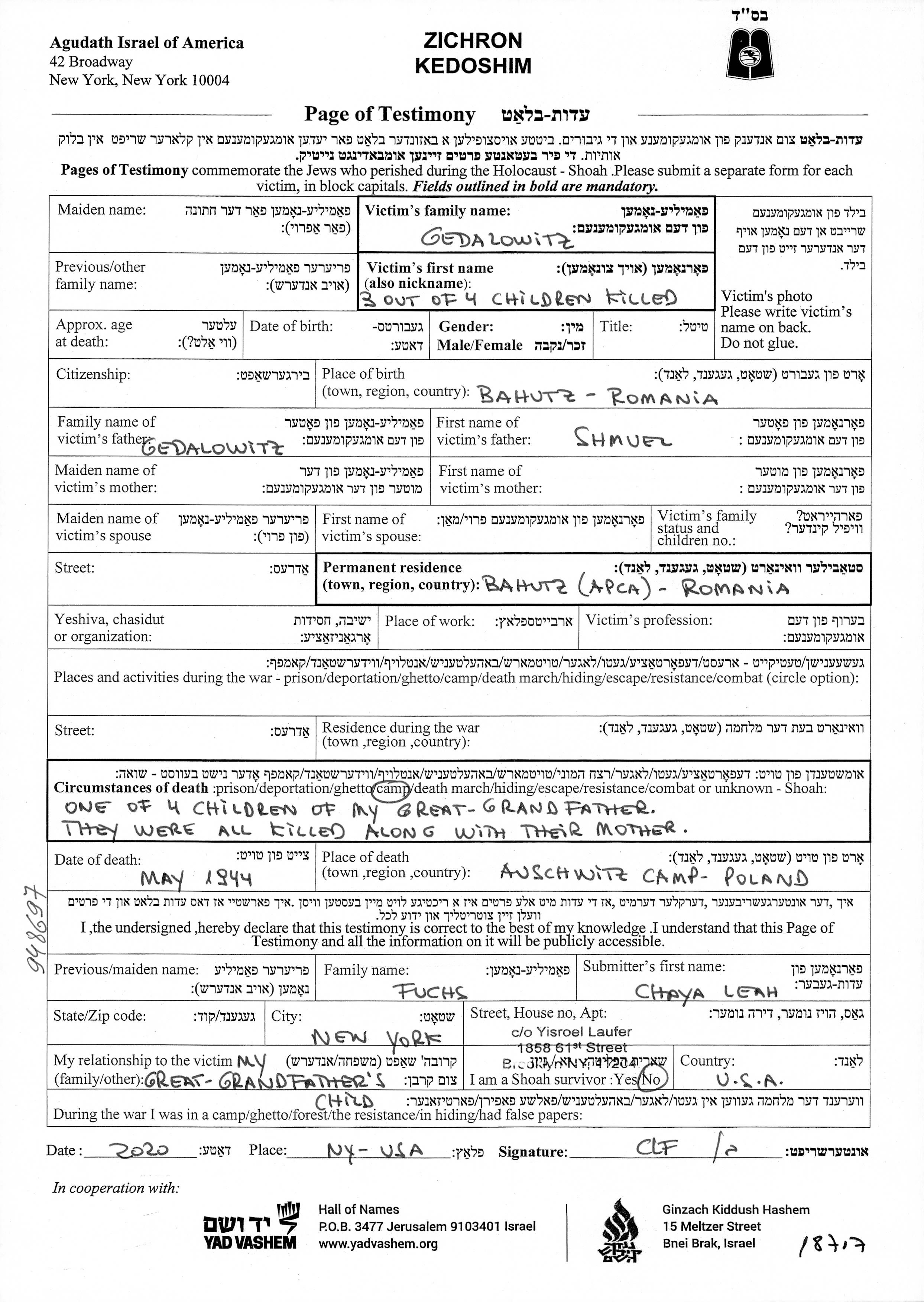 Vorname unbekannt Gedalowitz wurde in Baiut, Rumänien geboren. Er/sie war der/ die Sohn/Tochter von Shmuel. Er/Sie war Kind. Vor dem Zweiten Weltkrieg er/sie in Baiut, Rumänien. Während des Krieges war er/sie in Auschwitz, Polen.