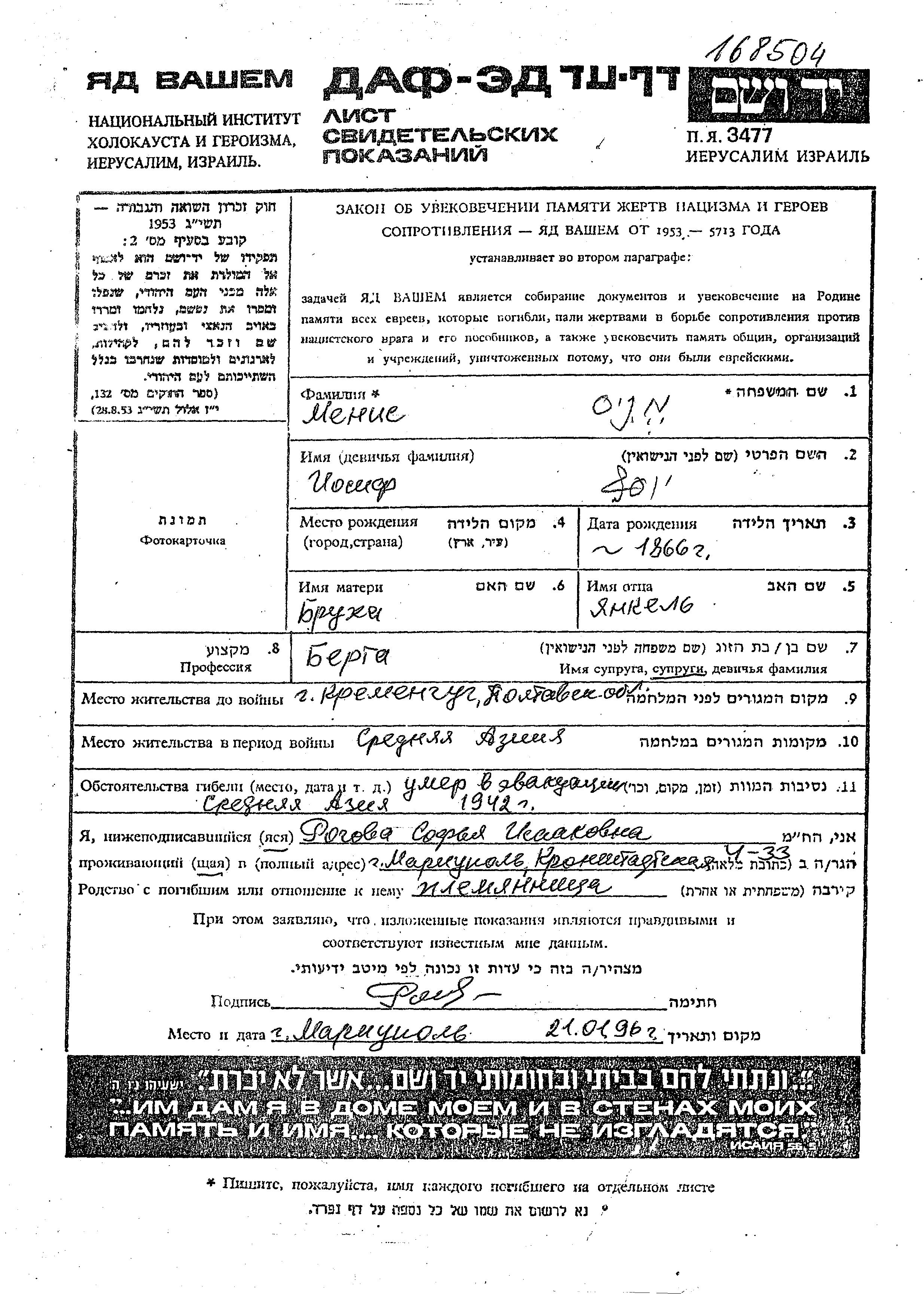 Iosif Menis wurde im Jahr 1866 geboren. Er war der Sohn von Yankel und Brukha. Er war mit Berta Verheiratet. Vor dem Zweiten Weltkrieg lebte er in Kremenchug, Ukraine (UdSSR). Während des Krieges war er in Central Asia Region, Sowjetunion.