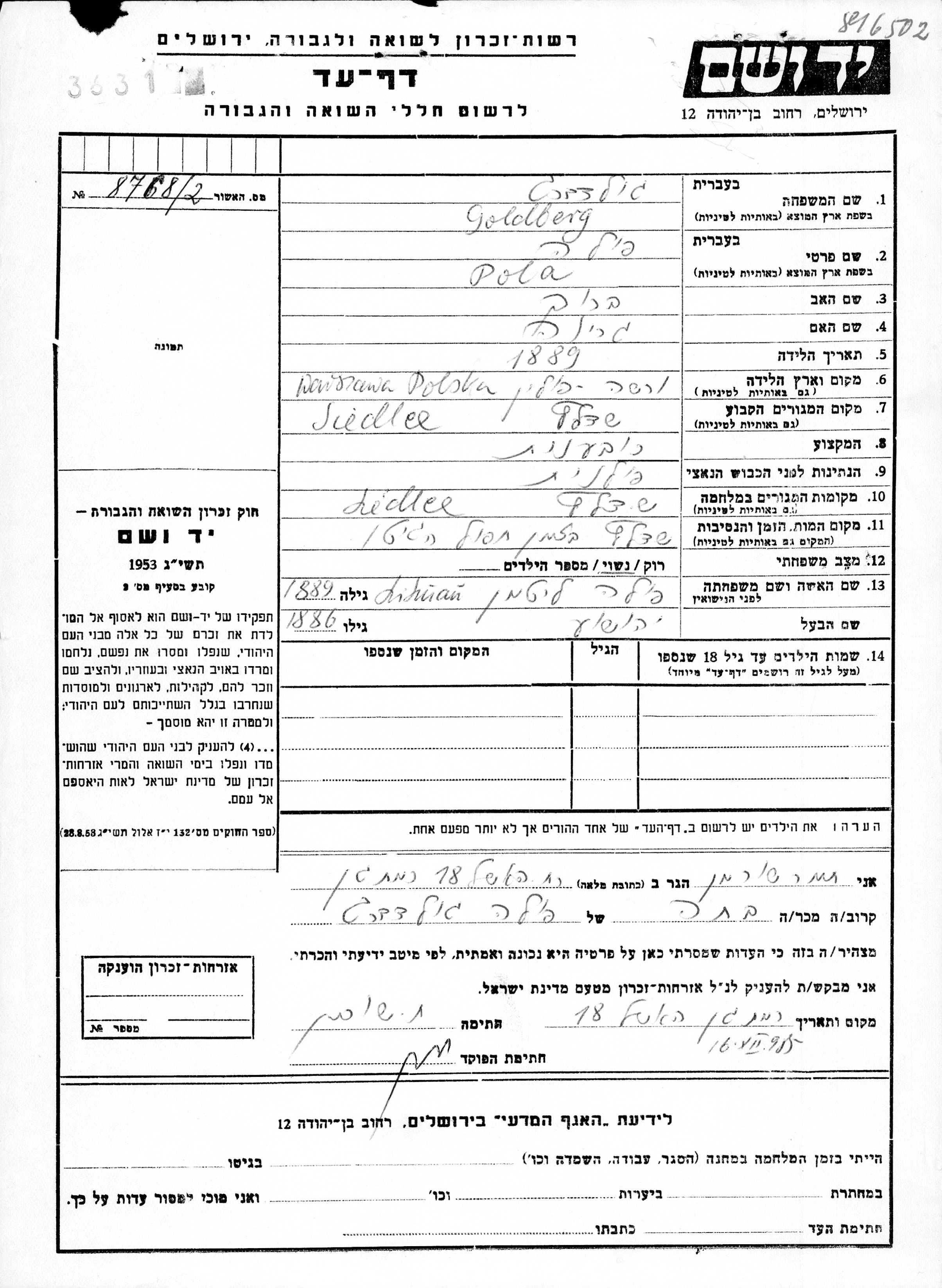 Pola Goldberg, geb. Litman wurde im Jahr 1889 in Warszawa, Polen geboren. Sie war die Tochter von Barukh und Gruna. Sie war Hutmacher/-in und mit Yehoshua Verheiratet. Vor dem Zweiten Weltkrieg lebte sie in Siedlce, Poland. Während des Krieges war sie in Siedlce, Poland.