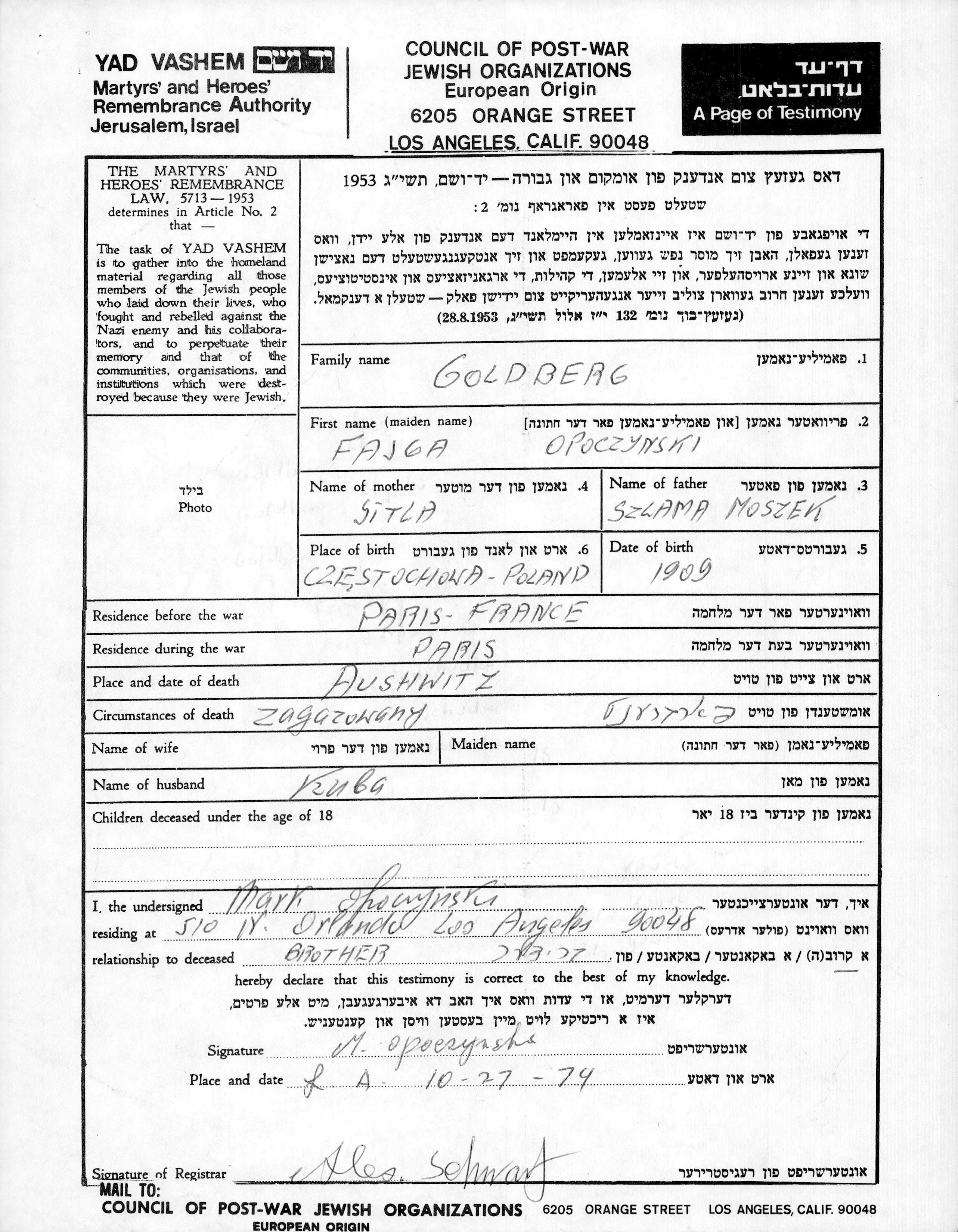 Fajga Goldberg, geb. Opoczynski wurde im Jahr 1909 in Czestochowa, Polen geboren. Sie war die Tochter von Szlama Moszek und Gitla. Sie war mit Kuba Verheiratet. Vor dem Zweiten Weltkrieg lebte sie in Paris, Frankreich. Während des Krieges war sie in Paris, Frankreich.