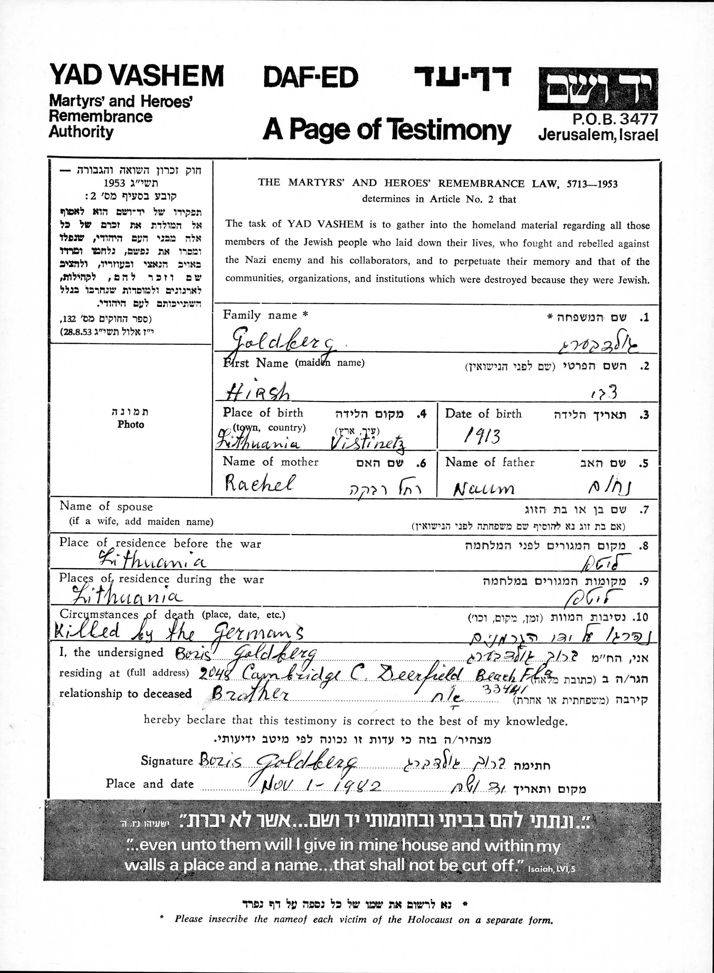 Hirsh Tzvi Goldberg wurde im Jahr 1913 in Vistytis, Litauen geboren. Er war der Sohn von Naum und Rachel Rivka. Vor dem Zweiten Weltkrieg lebte er in Litauen. Während des Krieges war er in Litauen.
