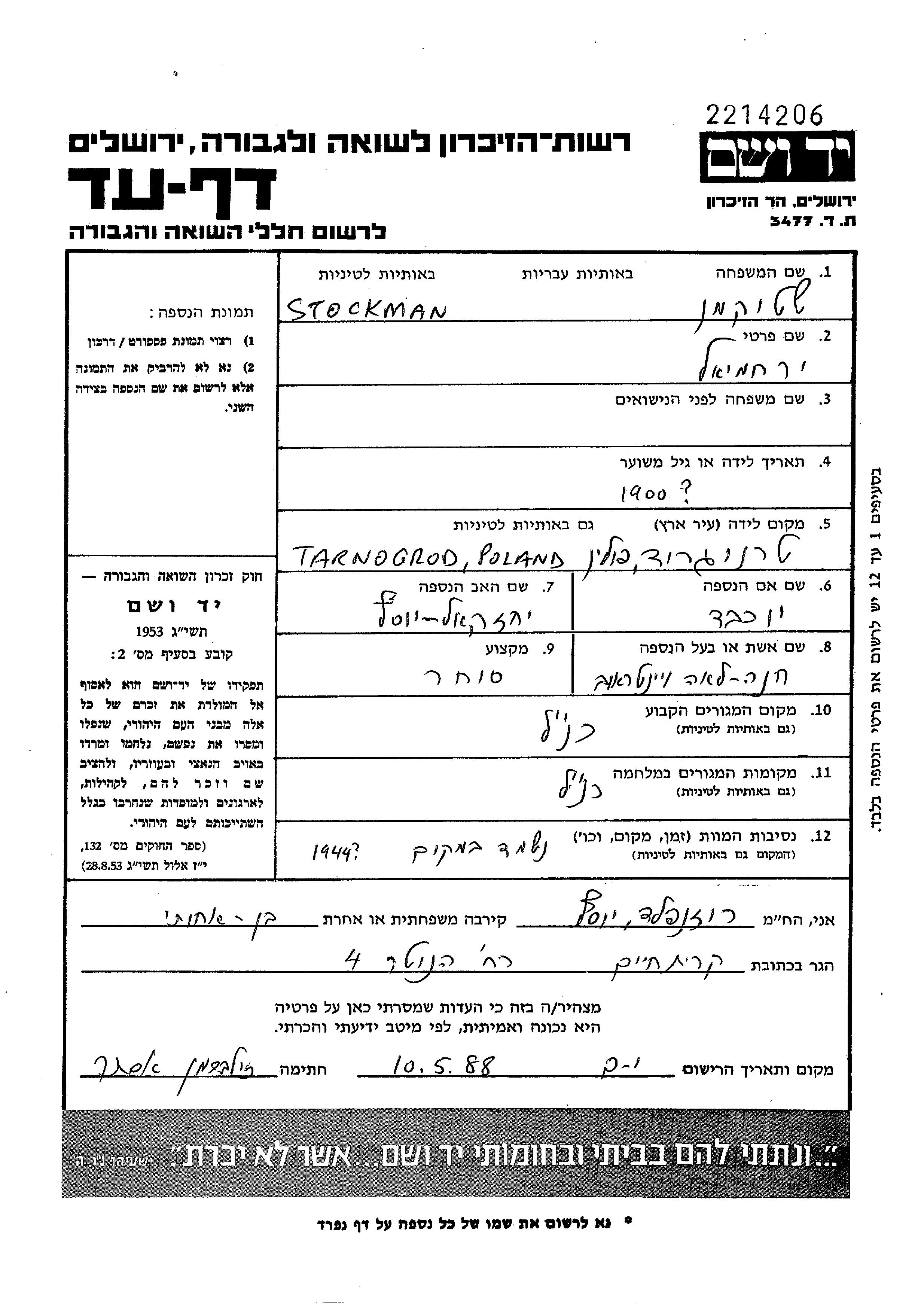 Sztokman Yerakhmiel 1905 Tarnobrod, Polen Gedenkblatt