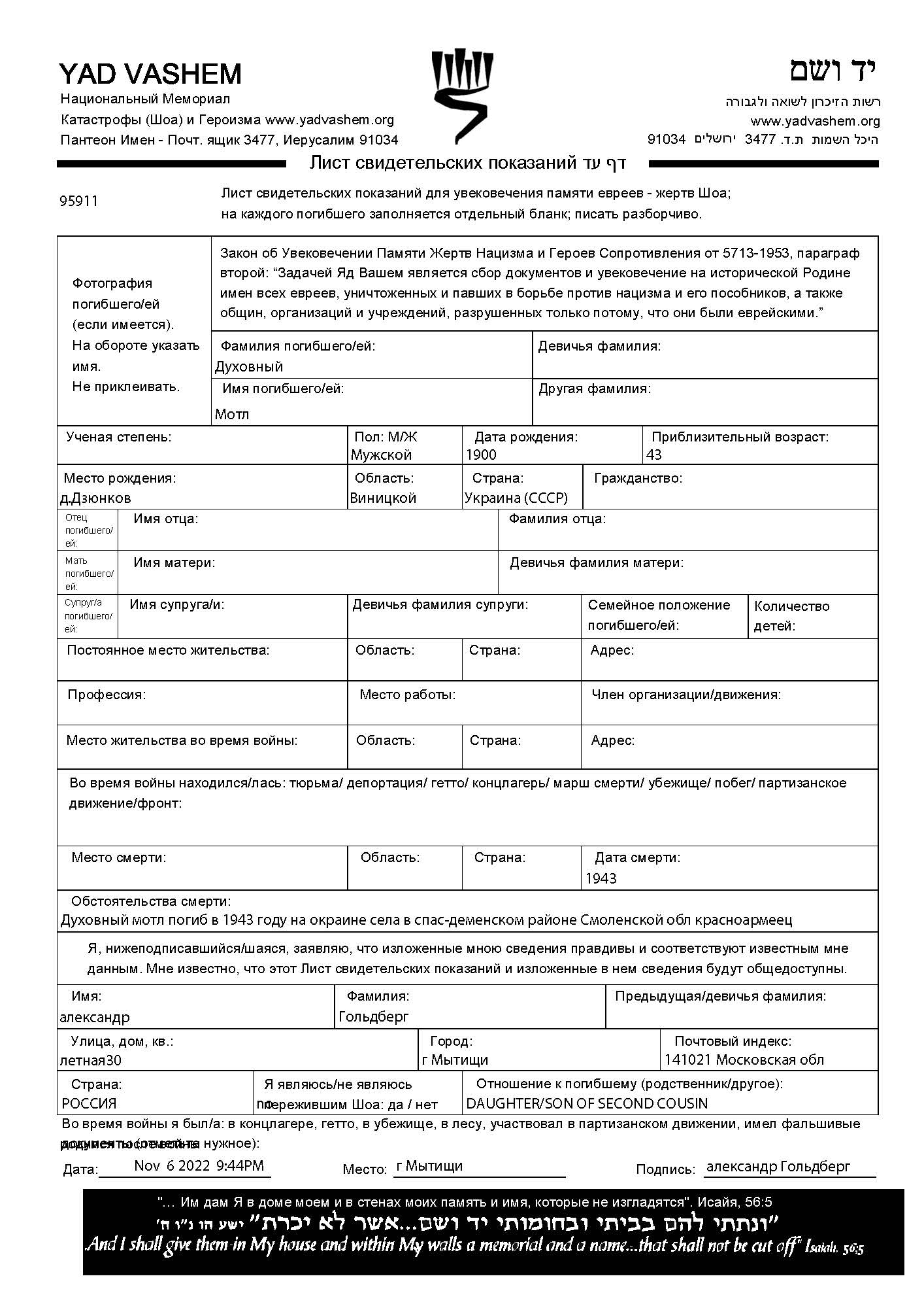 Motl Dukhovny wurde im Jahr 1900 in Dzyunkov, Ukraine (UdSSR) geboren. Vor dem Zweiten Weltkrieg lebte er in Sowjetunion. Während des Krieges war er in die Sowjetischen Streitkräfte.