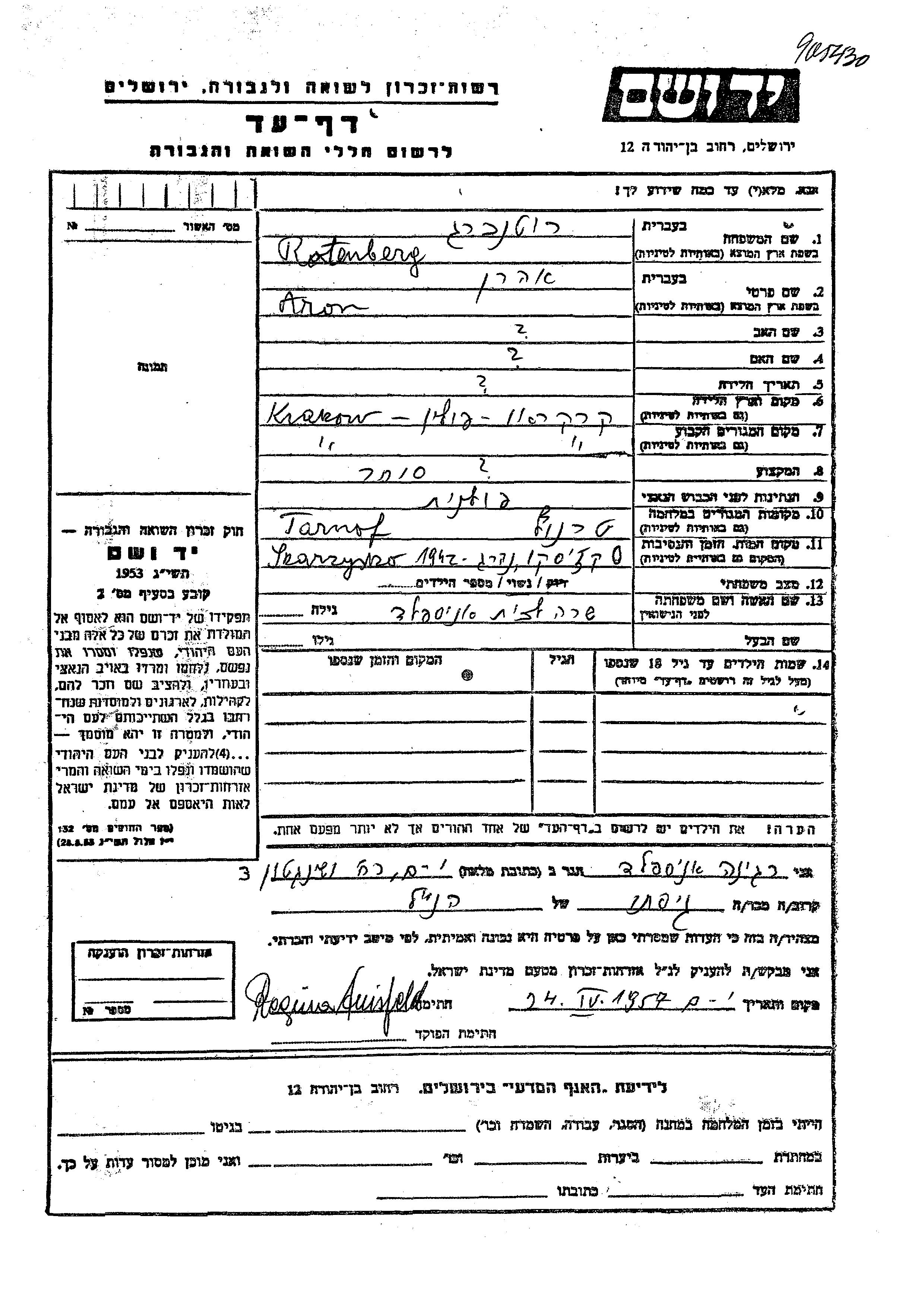 Aron Rotenberg wurde in Krakow, Polen geboren. Er war Kaufmann/-frau und mit Sara, geb. Anisfeld Verheiratet. Vor dem Zweiten Weltkrieg lebte er in Krakow, Polen. Während des Krieges war er in Tarnow, Polen.