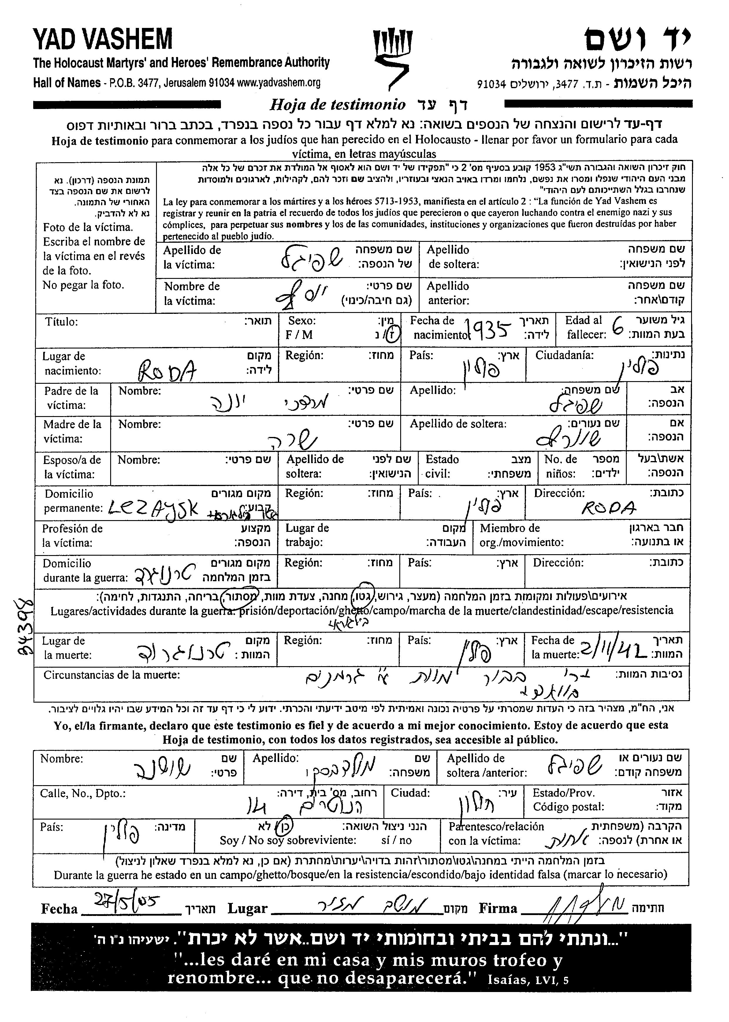 Yosef wurde in der Schoah ermordet. Todesort: Tarnogrod, Polen im Jahr 02/11/1942.