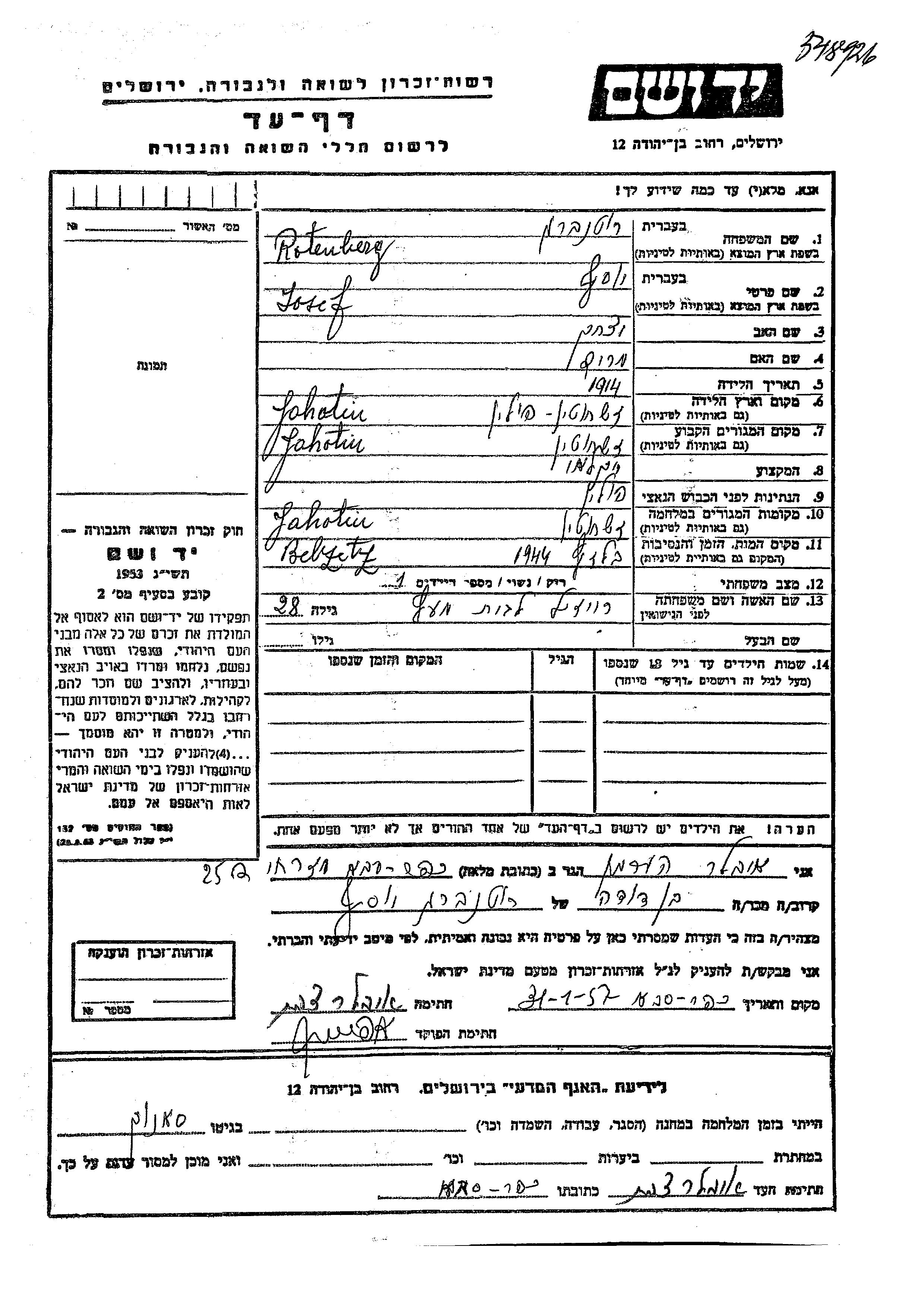 Rotenberg Josef 1914 Żohatyń, Polen Gedenkblatt