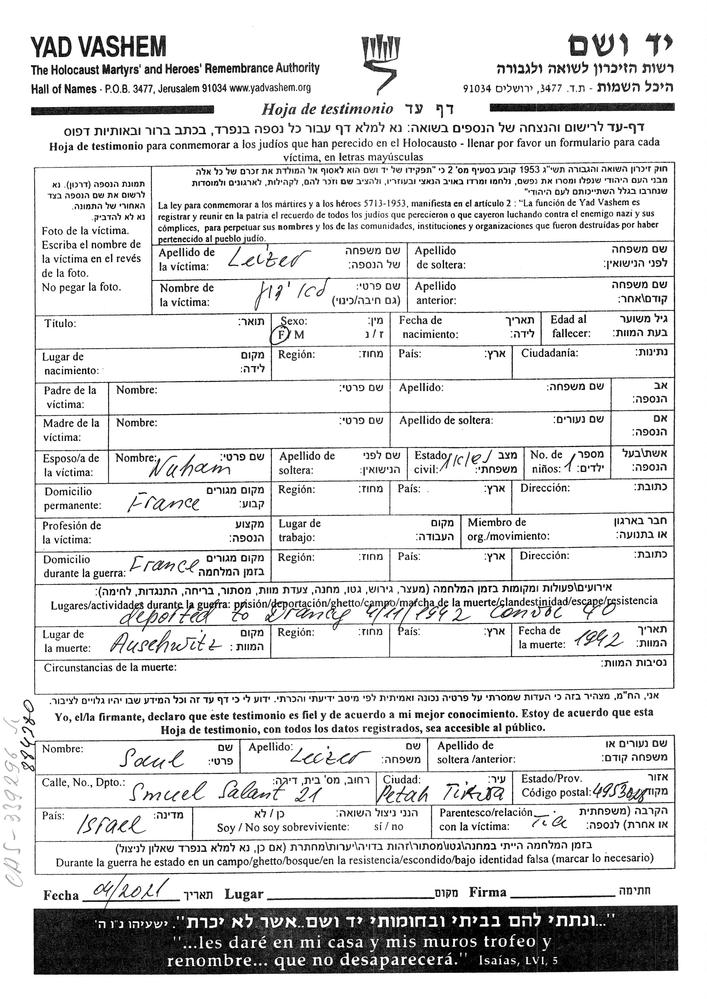 Leizer | Vorname unbekannt | Frankreich | Gedenkblatt | |