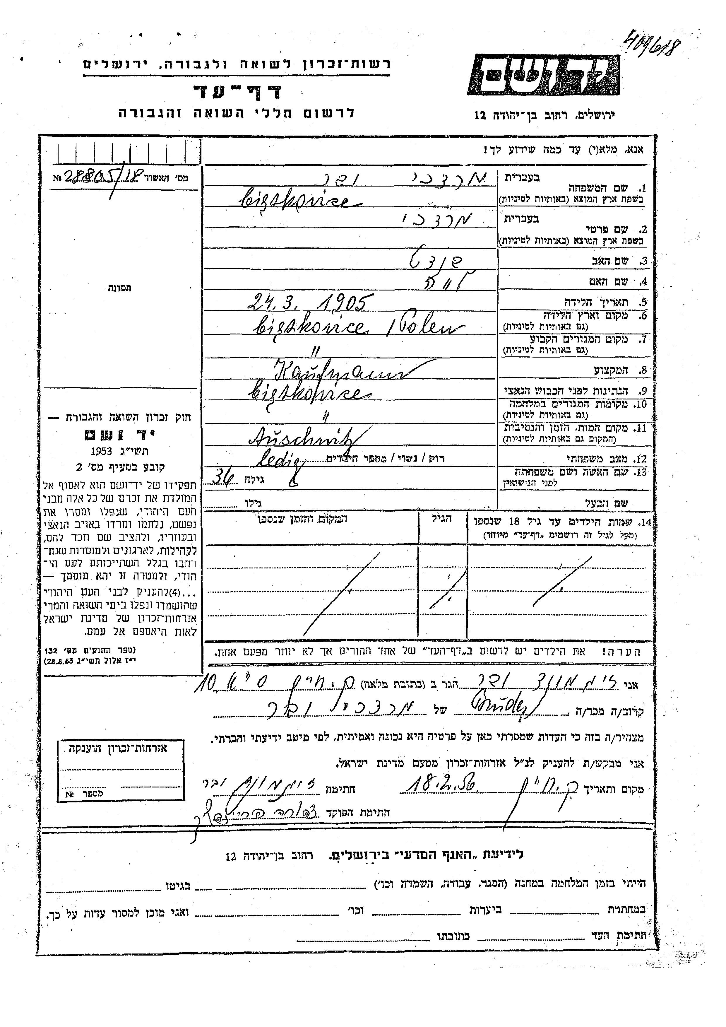 Vaver Mordekhai 1905 Buskovice, Tschechoslowakei Gedenkblatt