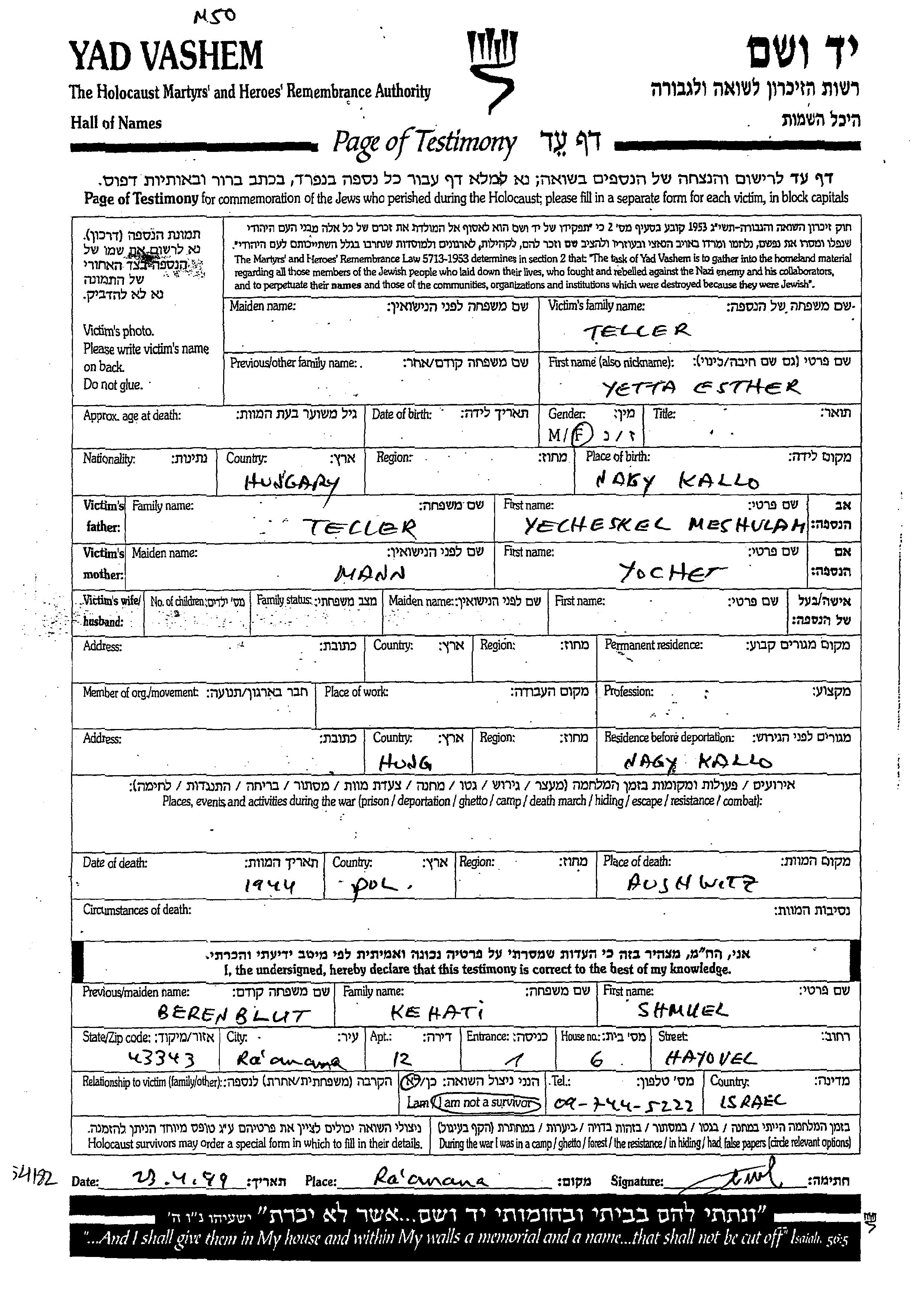 Teler Esther Racfert, Ungarn Aufzeichnungen ueber ermordete Personen