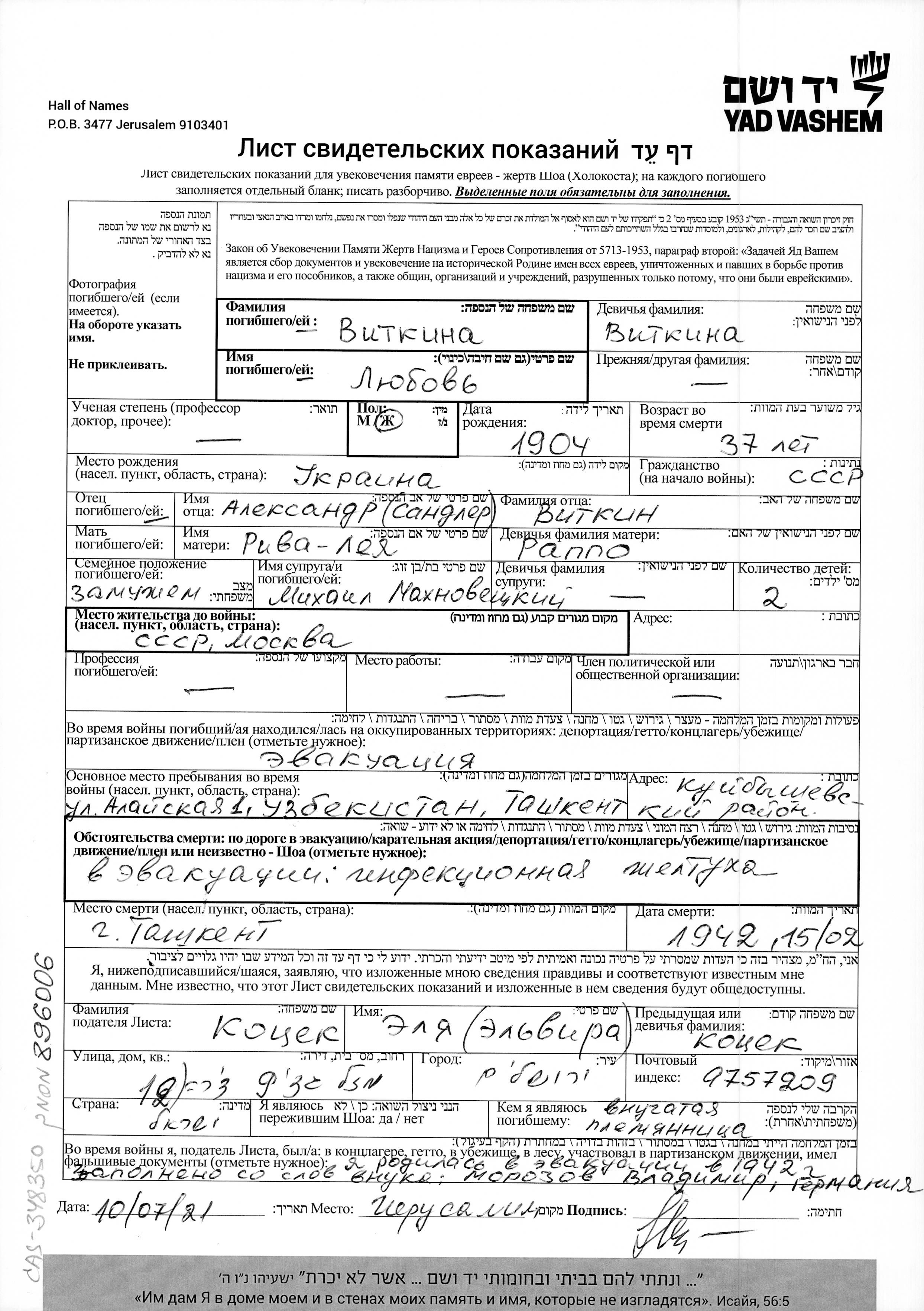 Lyubov Vitkina wurde in Ukraine (UdSSR) geboren. Vor dem Zweiten Weltkrieg lebte sie in Moskva, Russland (UdSSR). Lyubov wurde nach der Evakuierung/ ins Innere der Sowjetunion registriert.