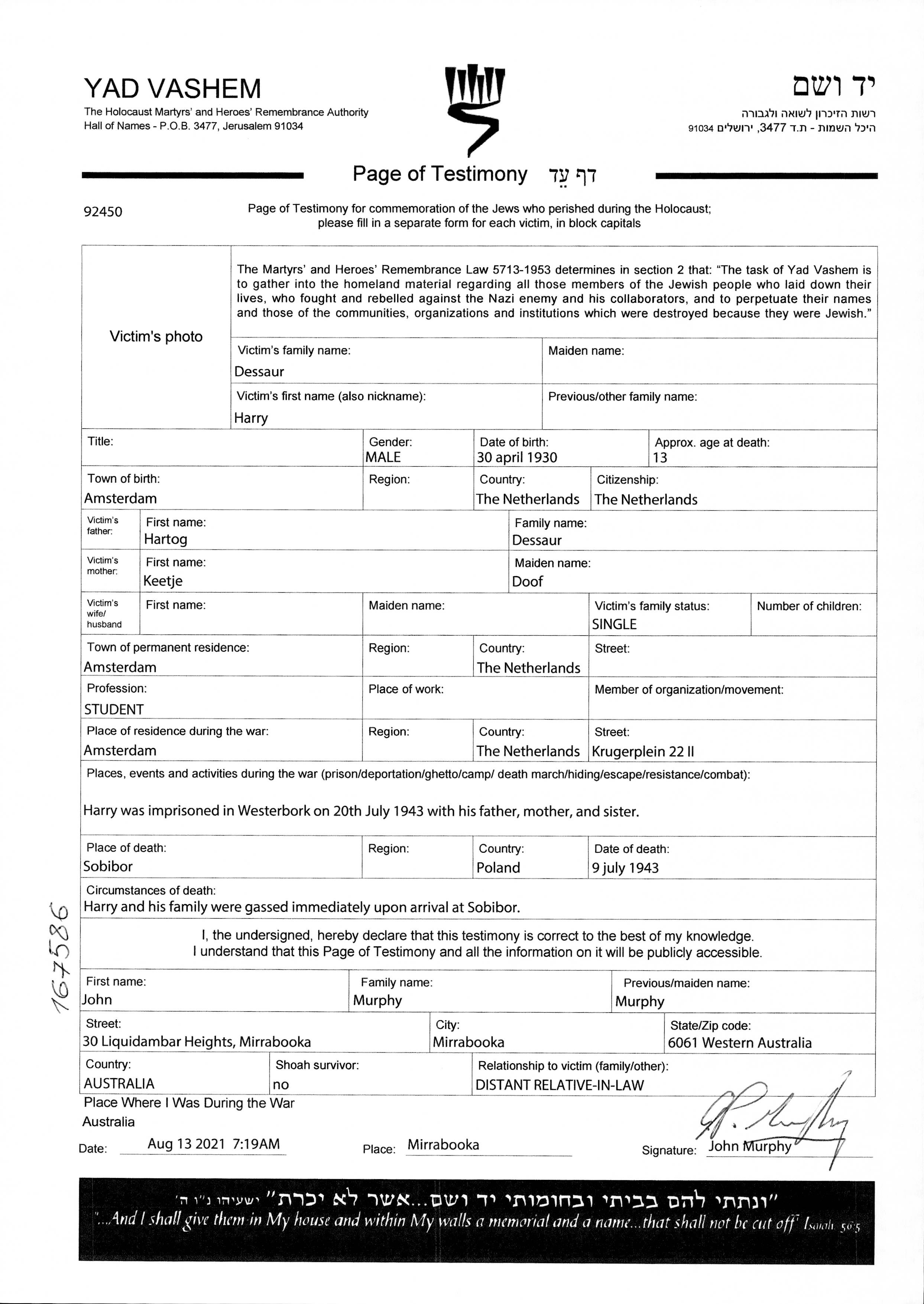 Dessaur | Harry | 1930 | Amsterdam, Niederlande | Gedenkblatt (digital, unterzeichnet) |