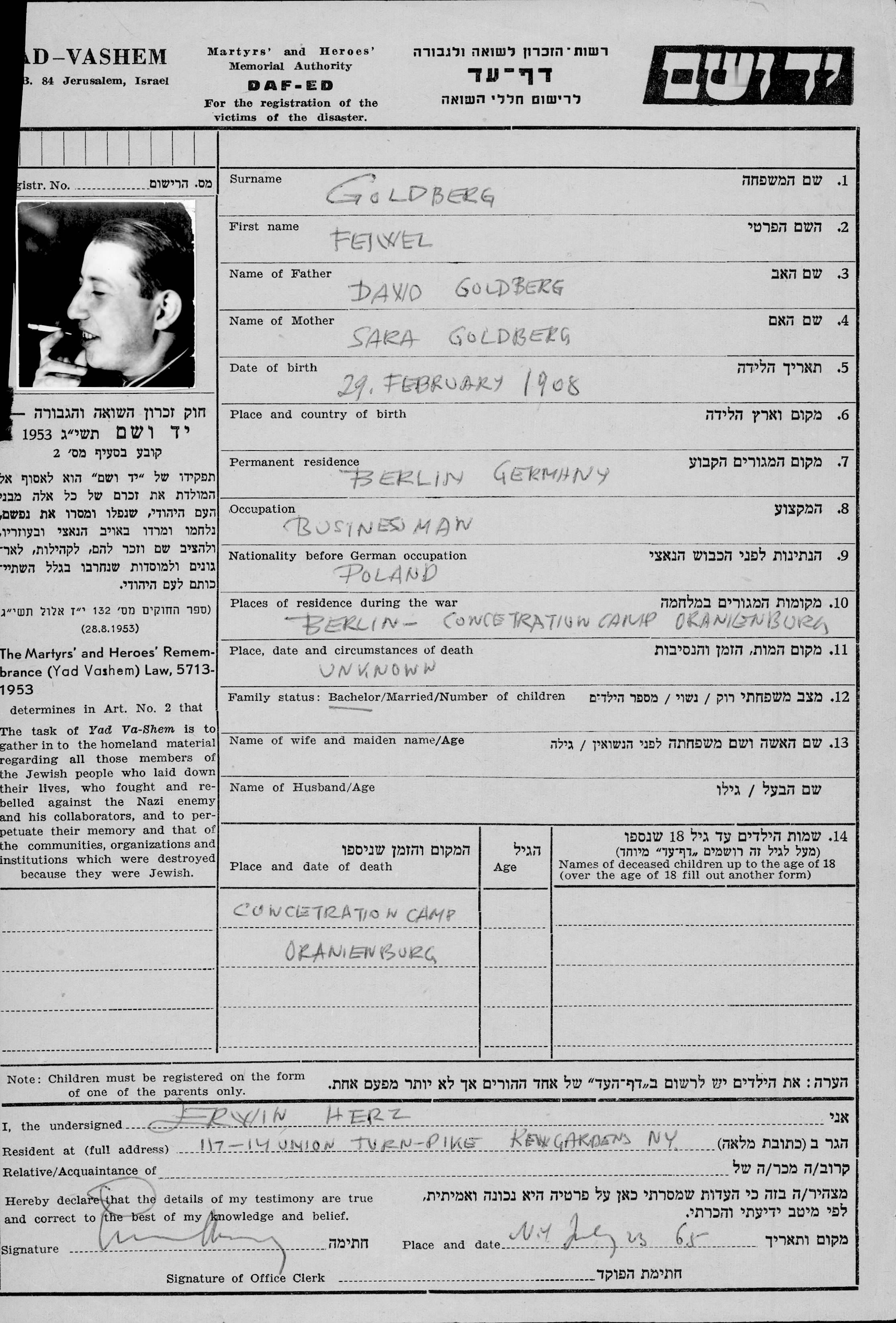 Feiwel Goldberg wurde im Jahr 1908 in Mielec geboren. Er war Geschäftsmann. Vor dem Zweiten Weltkrieg lebte er in Berlin, Deutsches Reich.