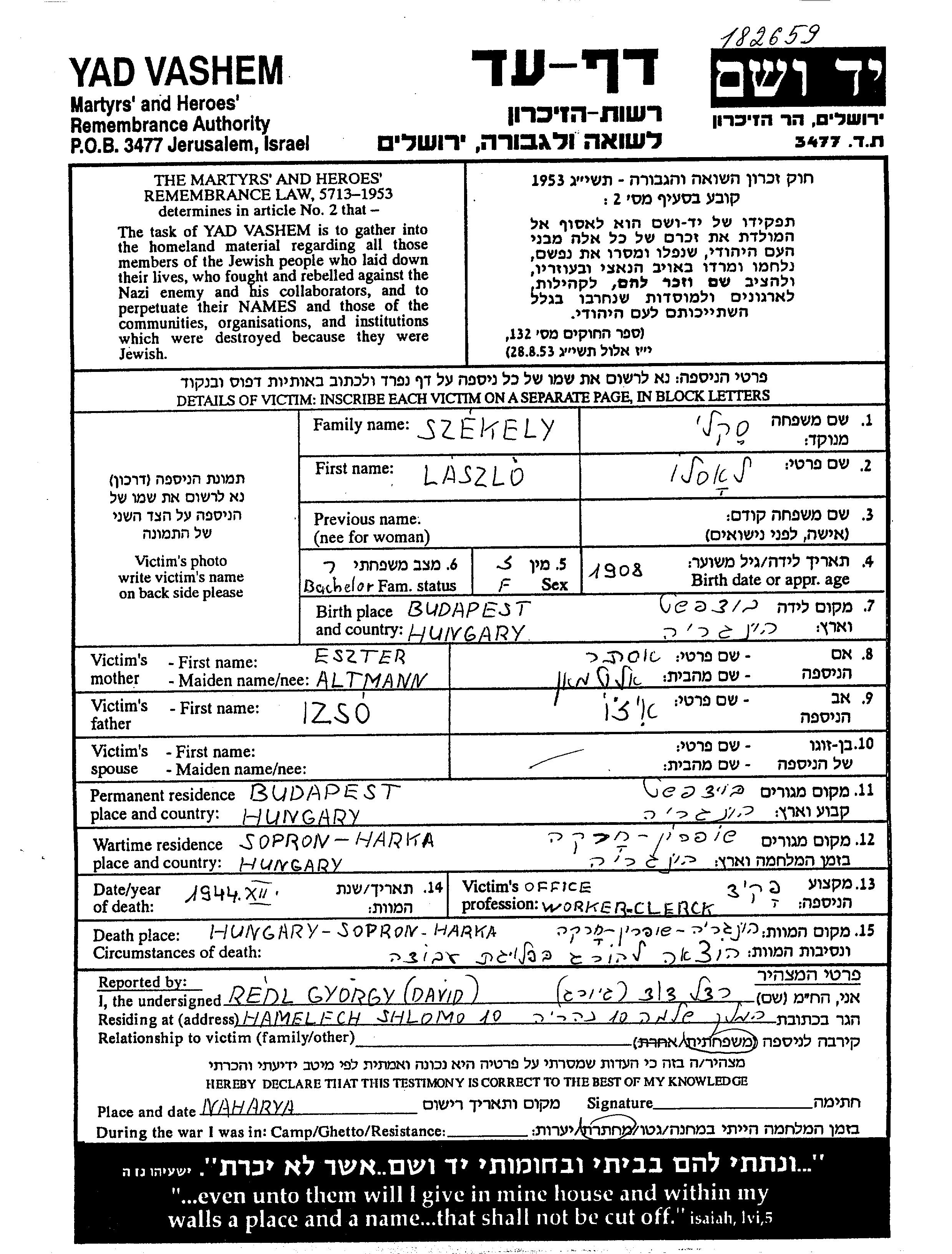 Laszlo Szekely wurde im Jahr 1908 in Budapest, Ungarn geboren. Er war der Sohn von Izso Izo und Eszter, geb. Altmann. Er war Angestellte/-r und Ledig. Vor dem Zweiten Weltkrieg lebte er in Budapest, Ungarn. Während des Krieges war er in Harka, Ungarn.