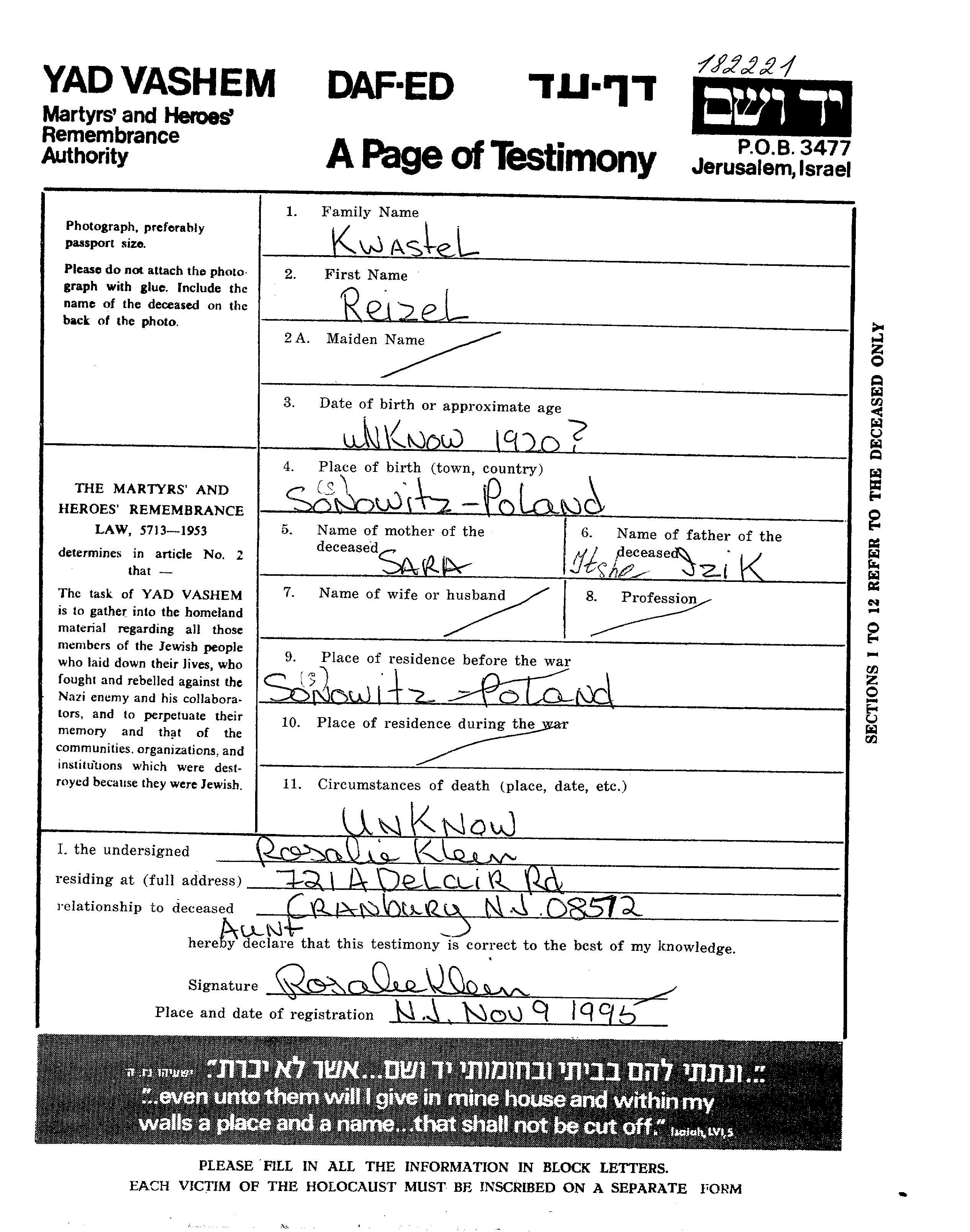 Reizl Kwastel wurde im Jahr 1920 in Sosnowiec, Polen geboren. Sie war die Tochter von Itshe Jzik und Sara. Sie war Ledig. Vor dem Zweiten Weltkrieg lebte sie in Sosnowiec, Polen. Während des Krieges war sie in Polen.