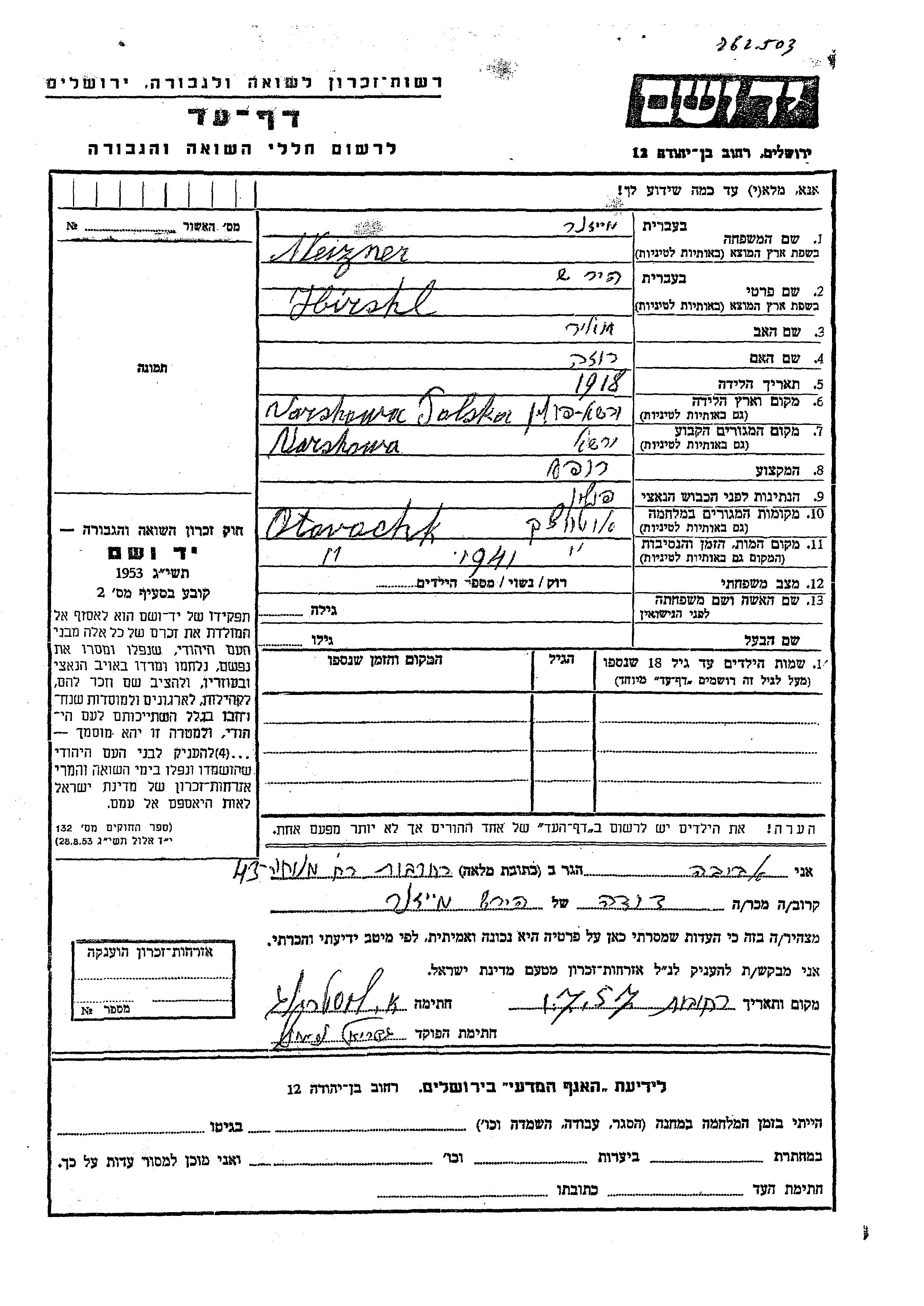 Hirshl Meizner wurde im Jahr 1918 in Warszawa, Polen geboren. Er war der Sohn von Meir und Roza. Er war Arzt/ärztin. Vor dem Zweiten Weltkrieg lebte er in Warszawa, Polen. Während des Krieges war er in Otwock, Polen.