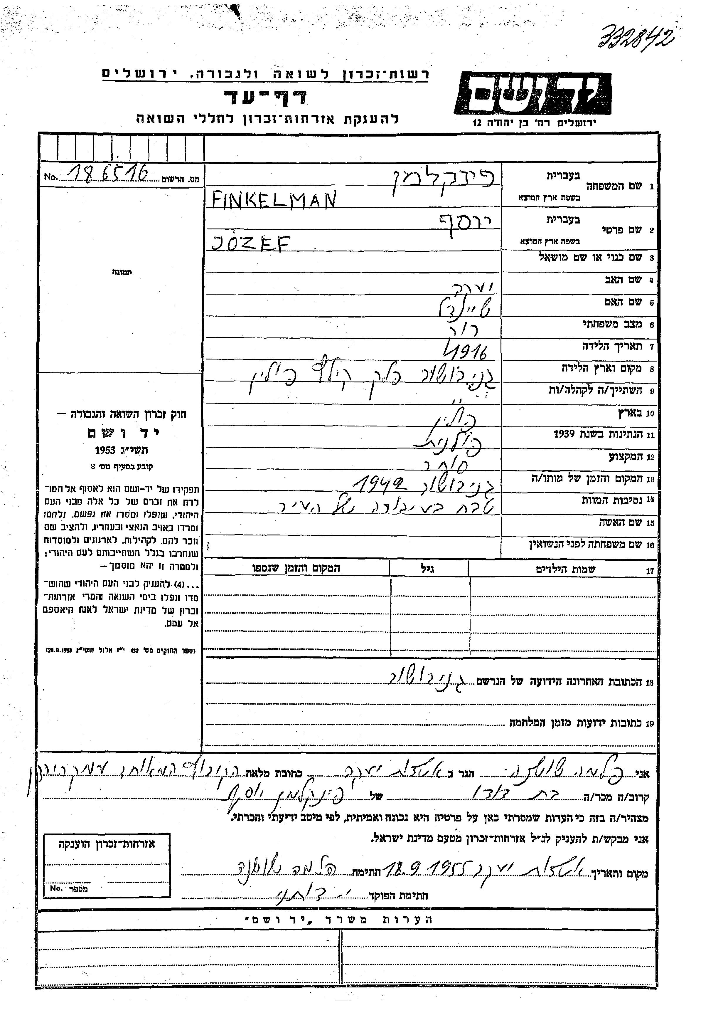 Jozef Finkelman wurde im Jahr 1916 in Kielce, Polen geboren. Er war der Sohn von Yaakov und Sheindl. Er war Kaufmann/-frau und Ledig. Vor dem Zweiten Weltkrieg lebte er in Kielce, Polen. Während des Krieges war er in Gniewoszow, Polen.