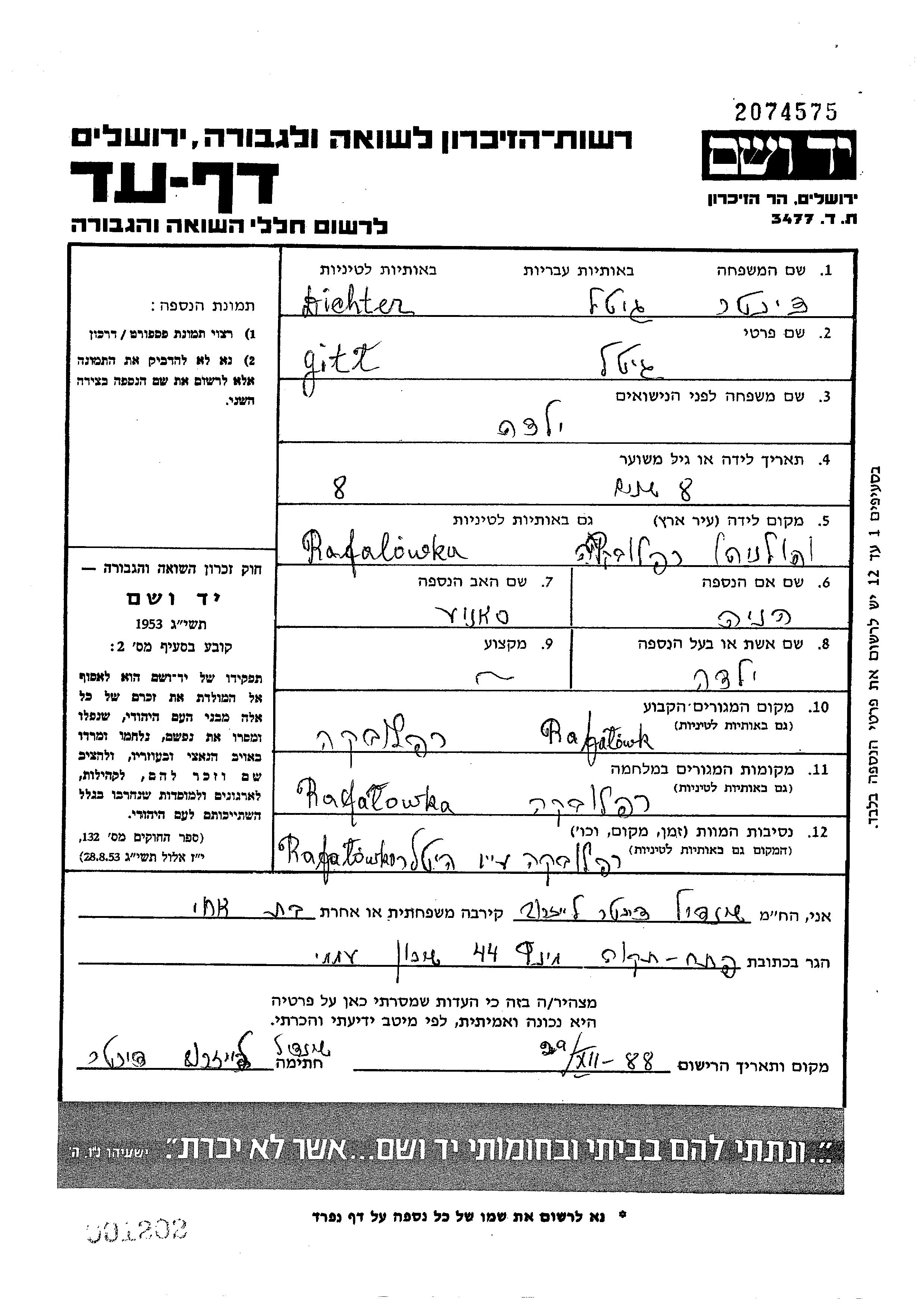 Gitl Dichter wurde in Rafałówka, Polen geboren. Sie war die Tochter von Sonie und Henia. Sie war Kind. Vor dem Zweiten Weltkrieg lebte sie in Rafałówka, Polen. Während des Krieges war sie in Rafałówka, Polen.