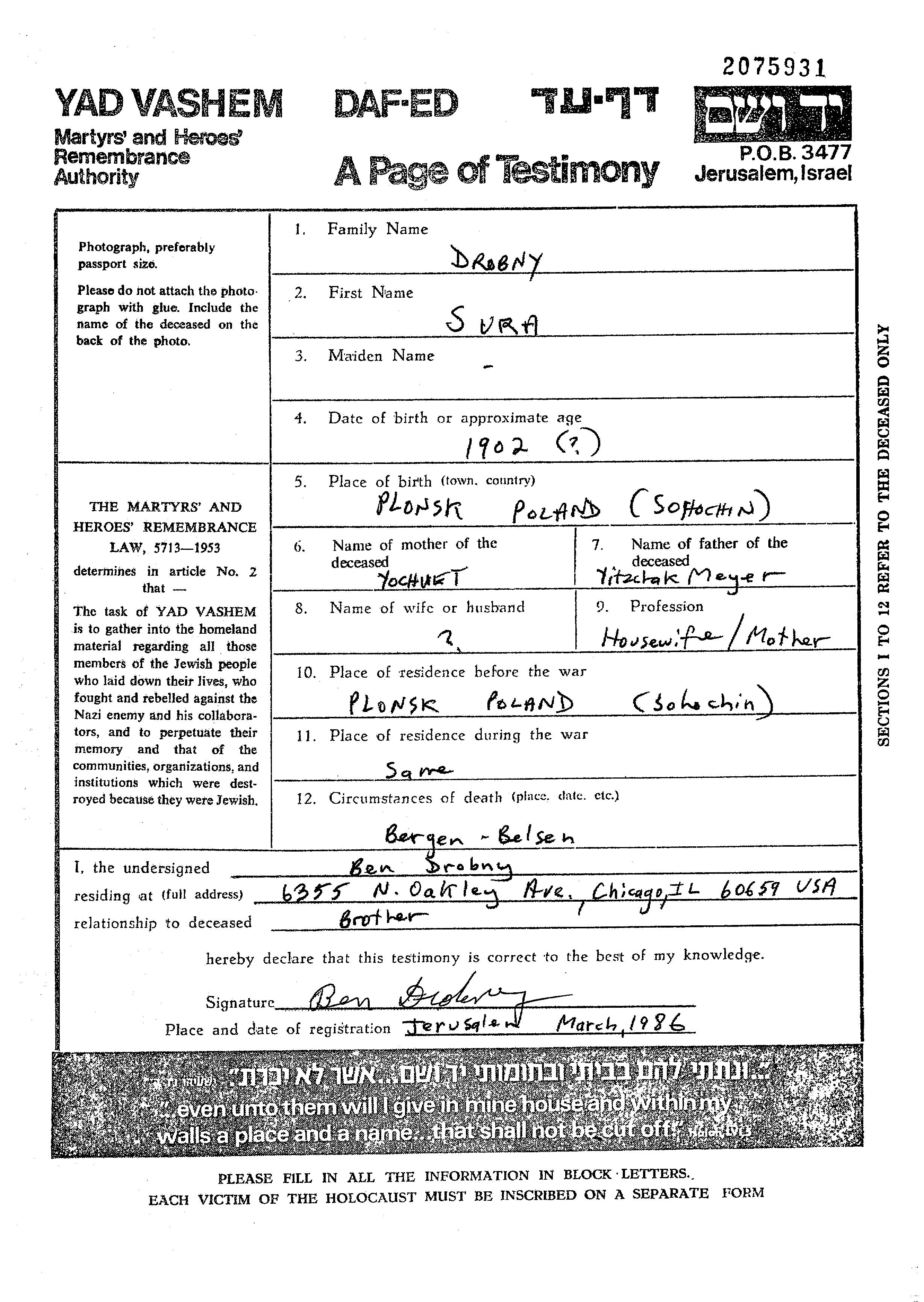 Sura Drobny wurde in Plonsk, Polen geboren. Sie war die Tochter von Yitzchak Meyer und Yochwet, geb. Gitgwer. Sie war Hausfrau und Verheiratet. Vor dem Zweiten Weltkrieg lebte sie in Plonsk, Polen. Während des Krieges war sie in Plonsk, Polen.