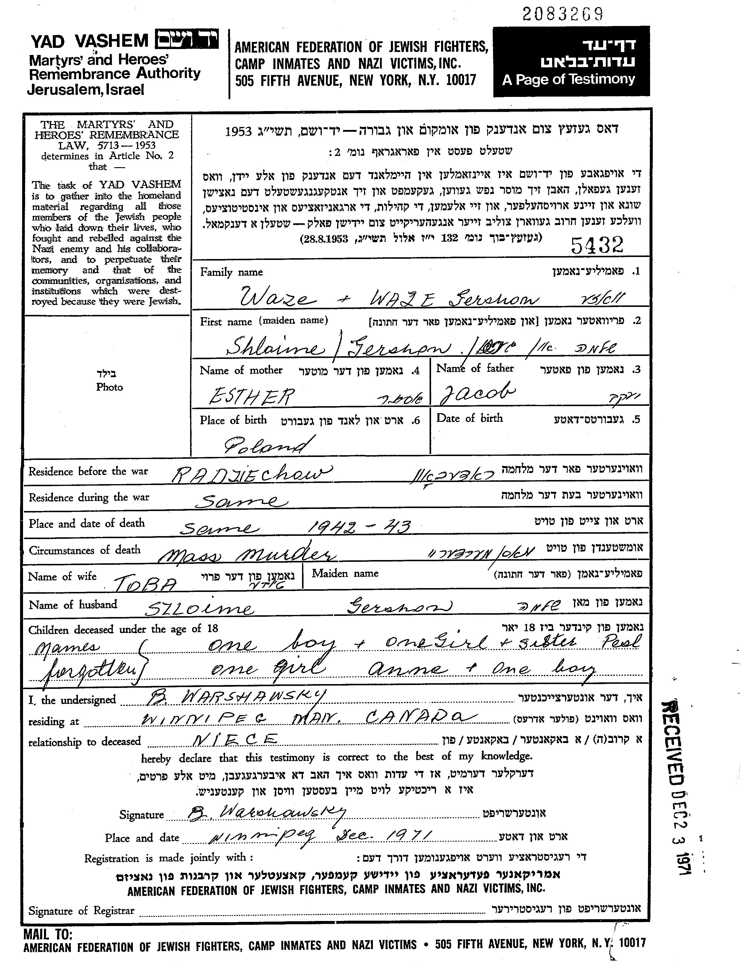 Shloime Waze wurde in Polen geboren. Er war der Sohn von Jacob und Esther. Er war mit Toba Tova Verheiratet. Vor dem Zweiten Weltkrieg lebte er in Radziechow, Polen. Während des Krieges war er in Radziechow, Polen.