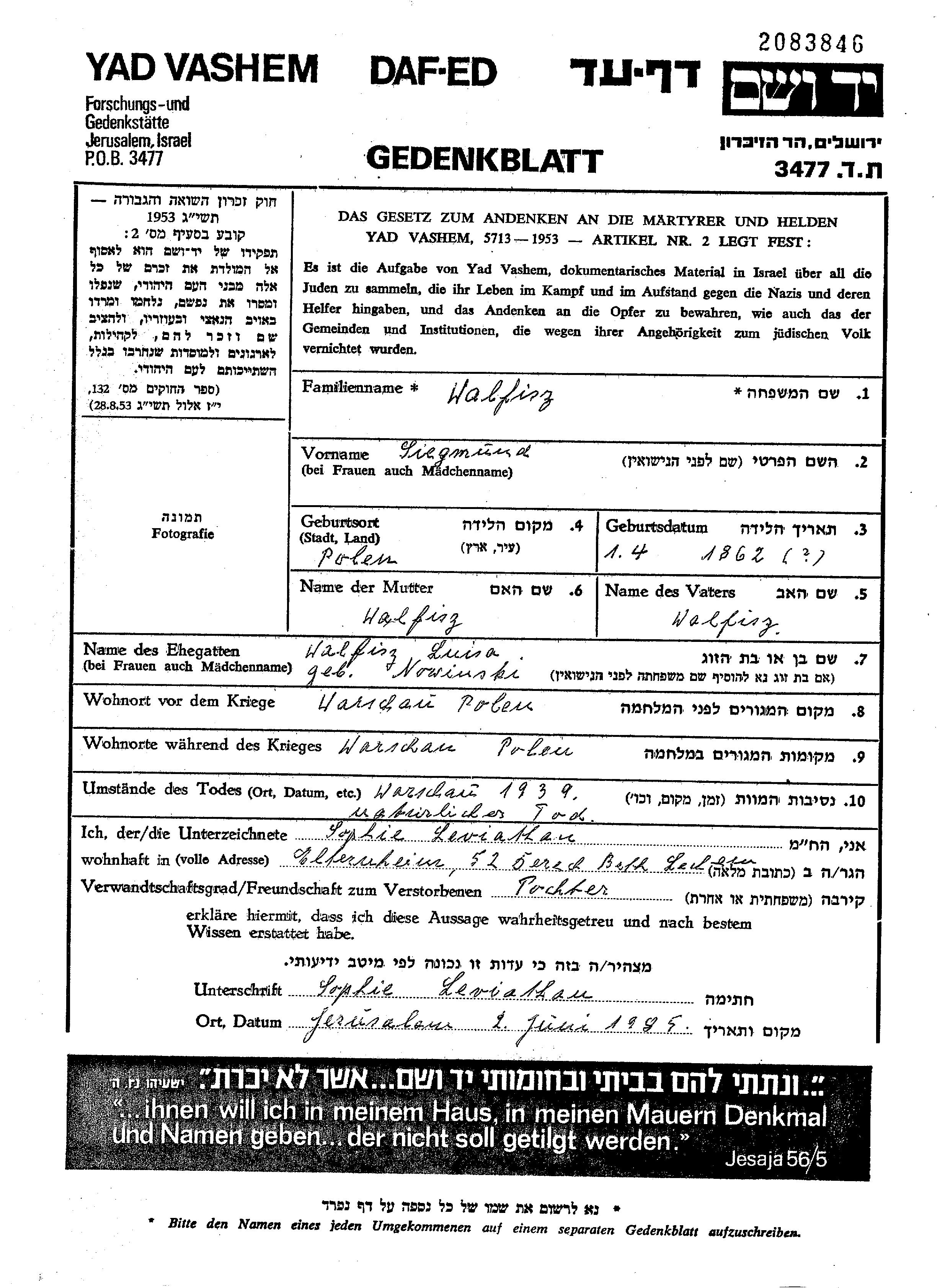 Siegmund Walfisz wurde im Jahr 1862 in Polen geboren. Er war mit Luisa Verheiratet. Vor dem Zweiten Weltkrieg lebte er in Warszawa, Polen. Während des Krieges war er in Warszawa, Polen.