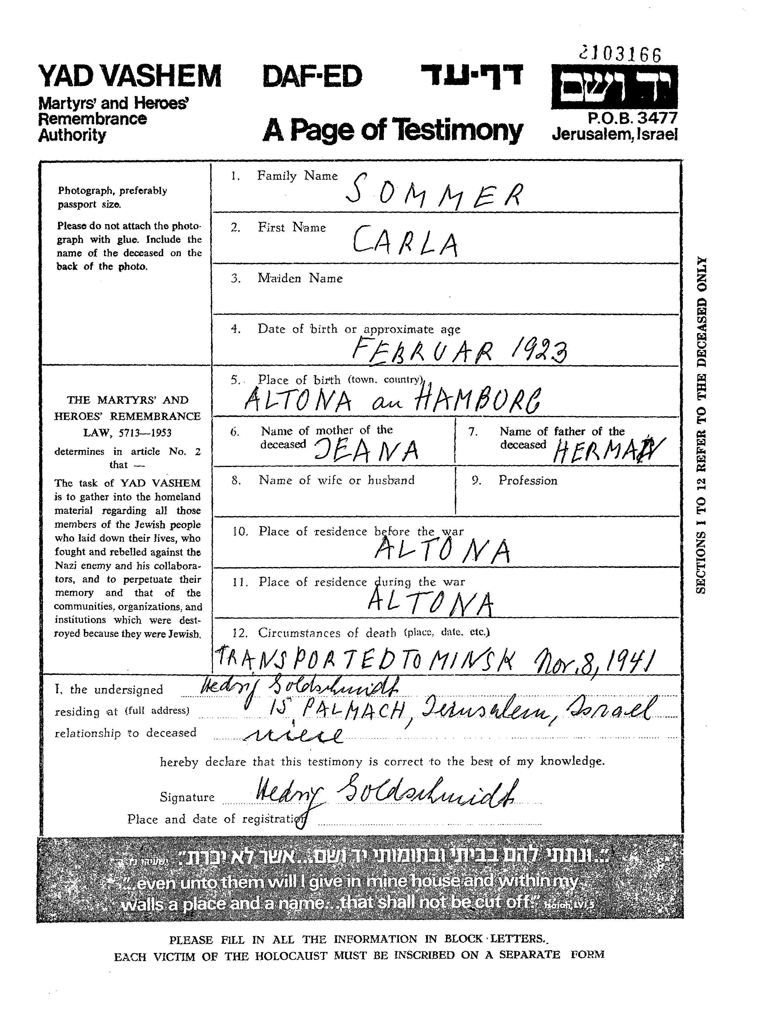 Carla Sommer wurde im Jahr 1923 in Altona, Deutsches Reich geboren. Sie war die Tochter von Herman und Jeanna, geb. Pinkusson. Sie war Ledig. Vor dem Zweiten Weltkrieg lebte sie in Altona, Deutsches Reich. Während des Krieges war sie in Altona, Deutsches Reich.