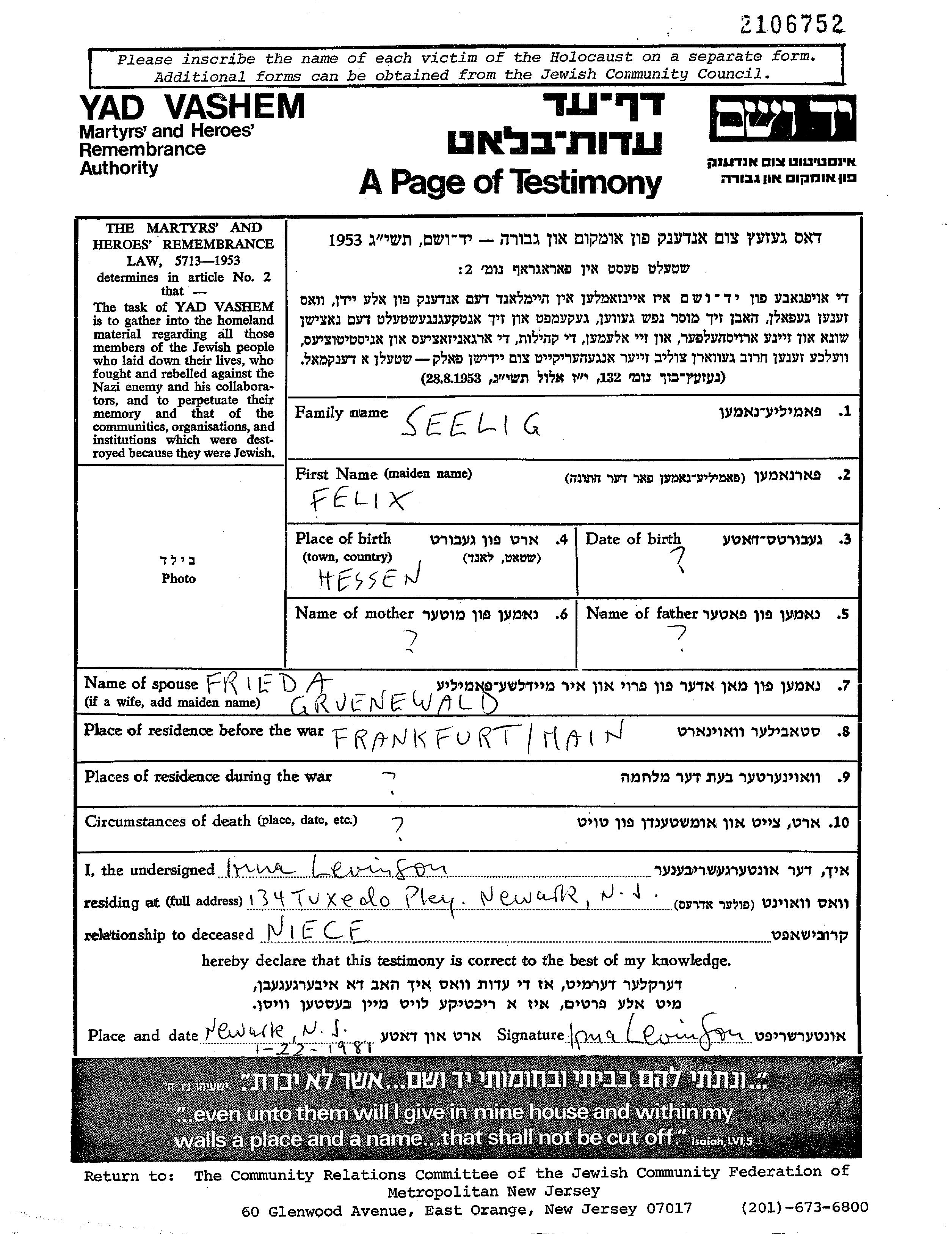 Felix Seelig wurde in Hessen, Deutsches Reich geboren. Er war mit Frieda Verheiratet. Vor dem Zweiten Weltkrieg lebte er in Frankfurt Main, Deutsches Reich.