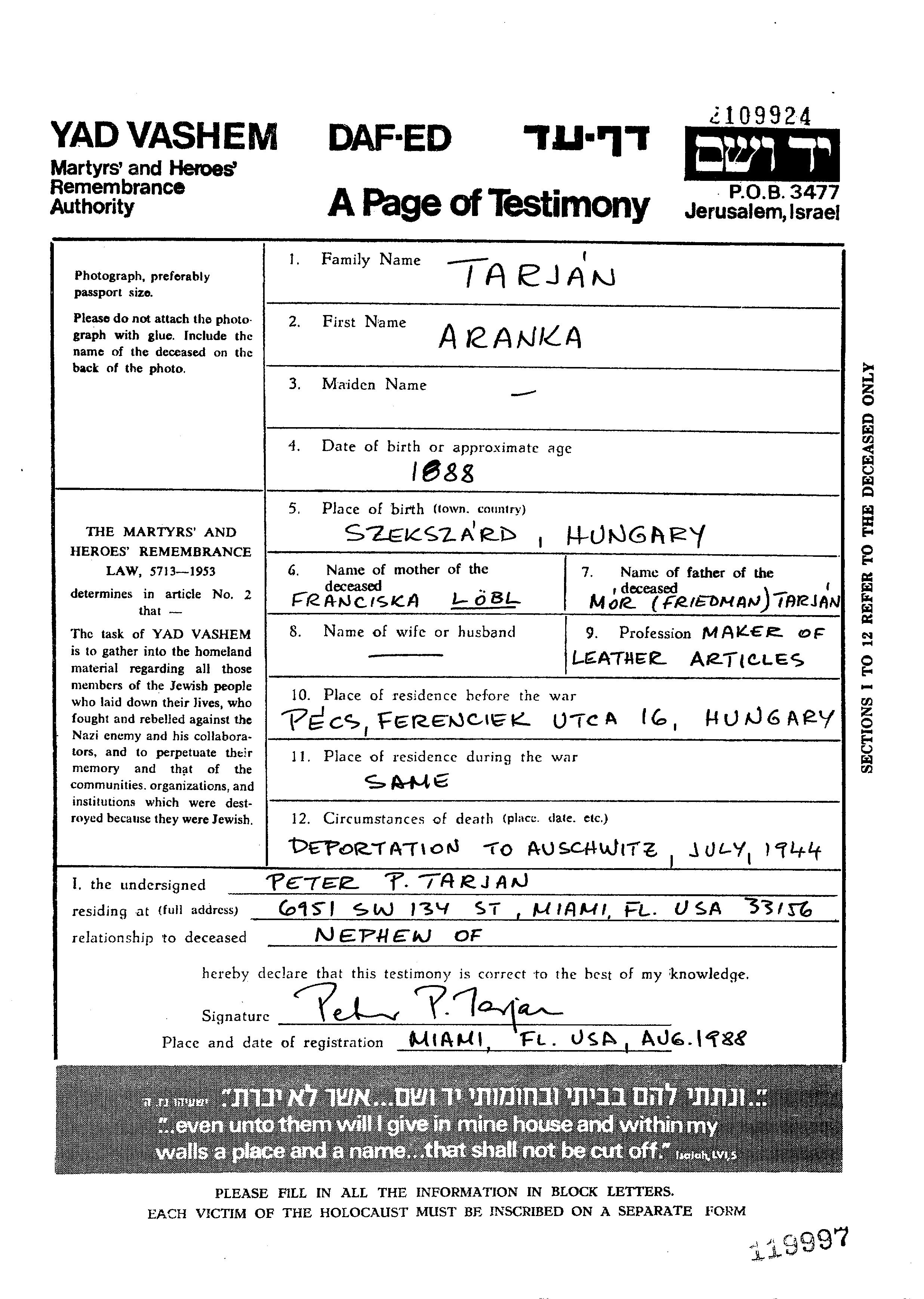 Aranka Tarjan wurde im Jahr 1888 in Szekszard, Ungarn geboren. Sie war die Tochter von Mor Friedman und Franciska, geb. Löbl. Sie war Gerber und Ledig. Vor dem Zweiten Weltkrieg lebte sie in Pecs, Ungarn. Während des Krieges war sie in Pecs, Ungarn.