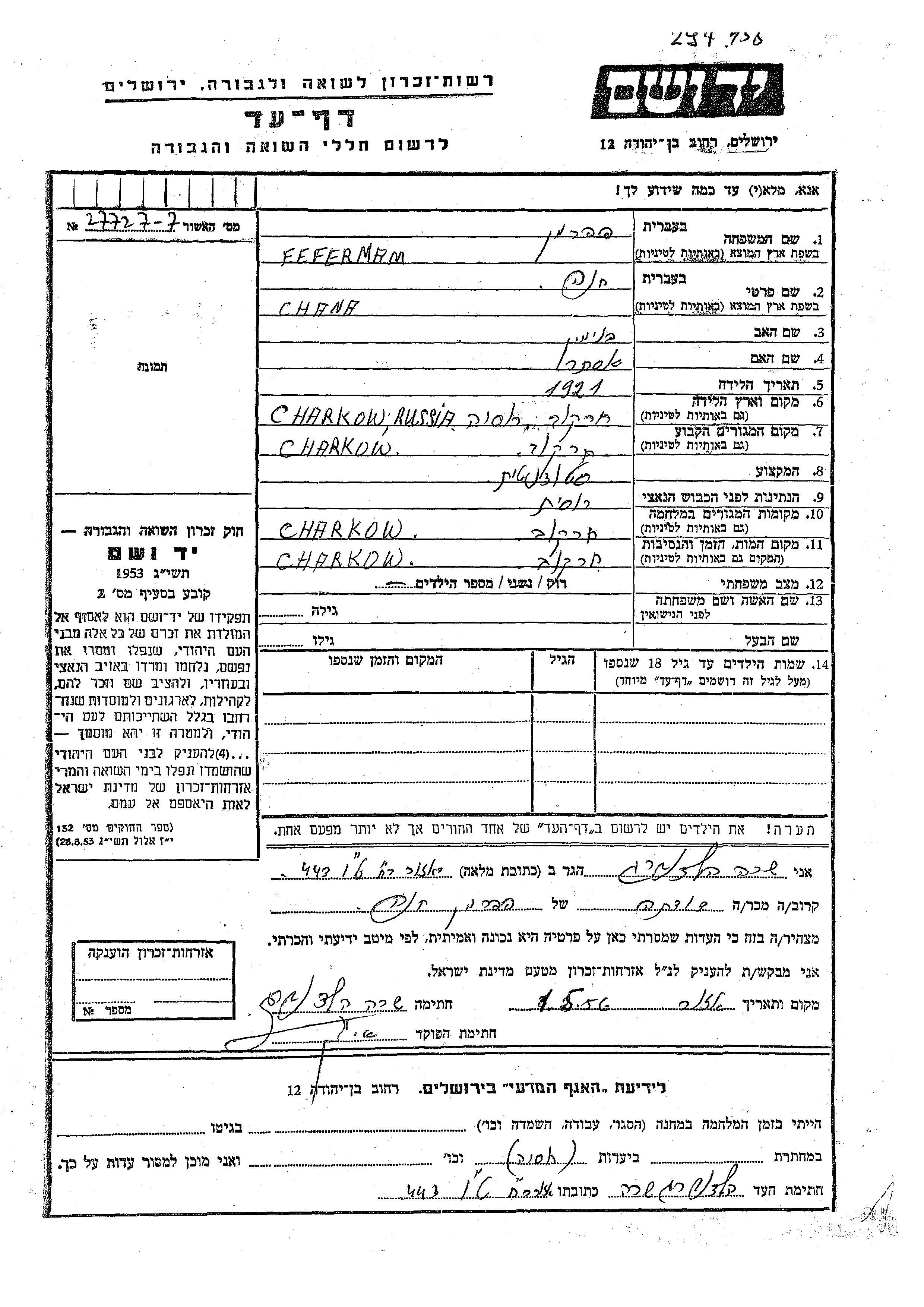 Feferman Chana 1921 Charkow, Ukraine (UdSSR) Gedenkblatt