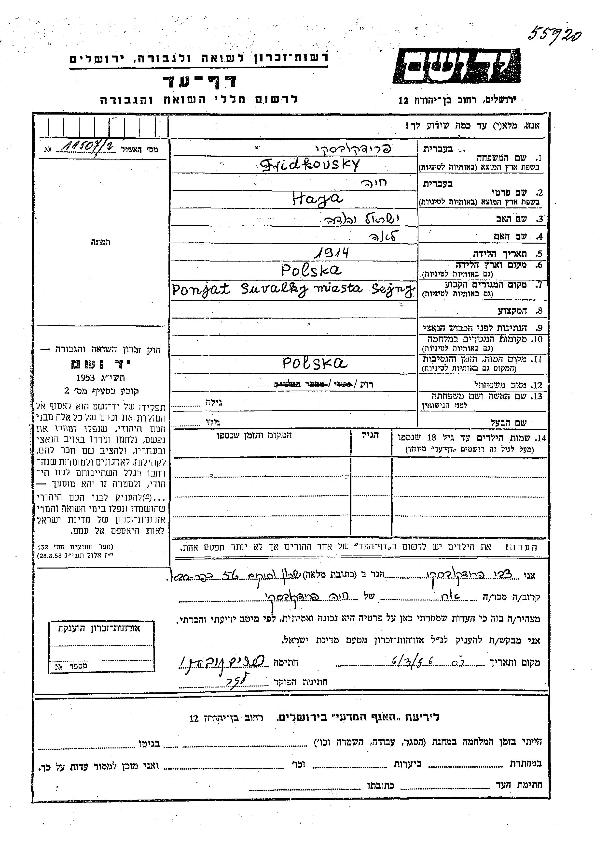 Haja Fridkovsky wurde im Jahr 1914 in Polen geboren. Sie war die Tochter von Yisrael Yehuda und Lea. Sie war Ledig. Vor dem Zweiten Weltkrieg lebte sie in Sejny, Polen.