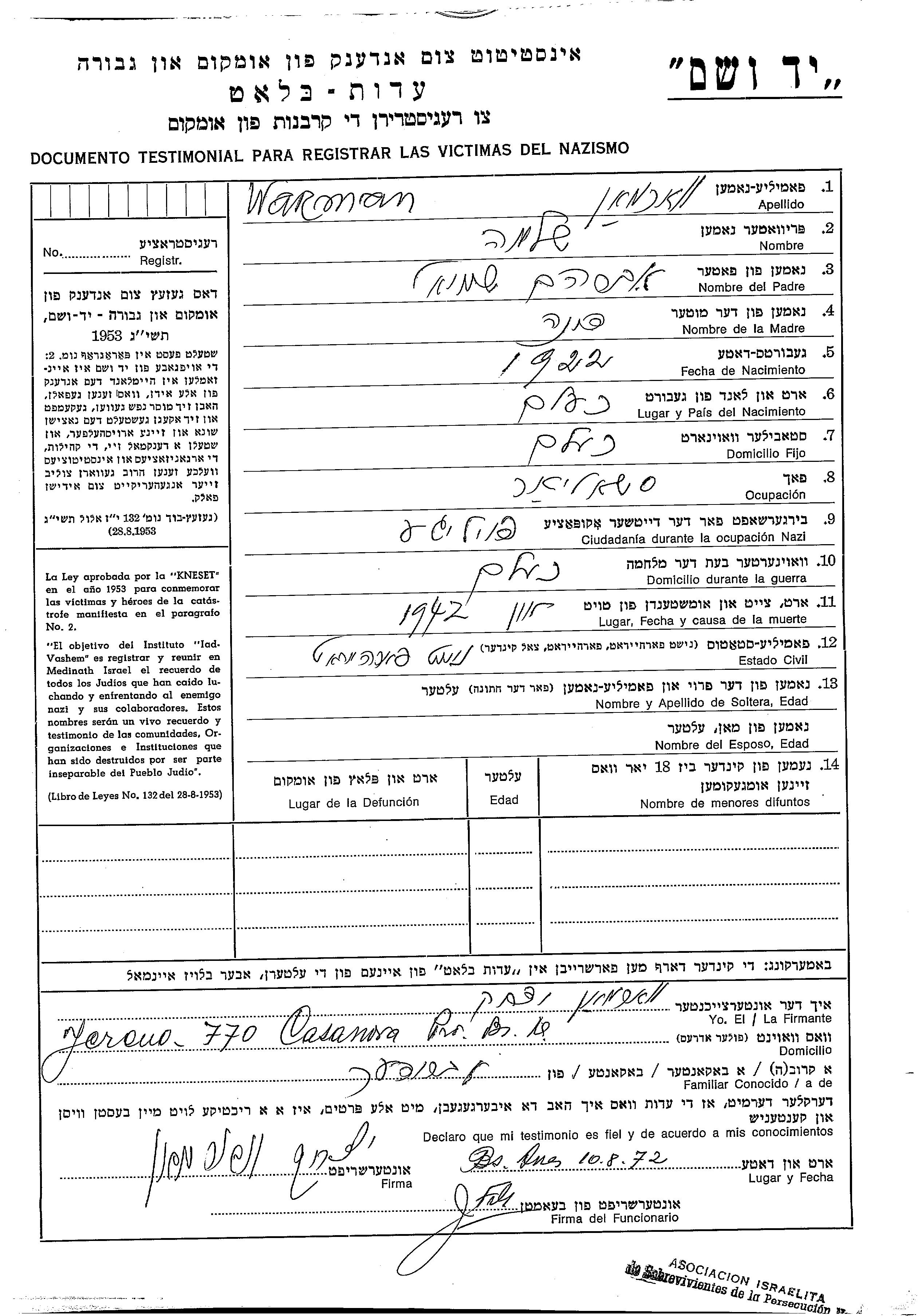Warman Shlomo 1922 Chelm, Polen Gedenkblatt