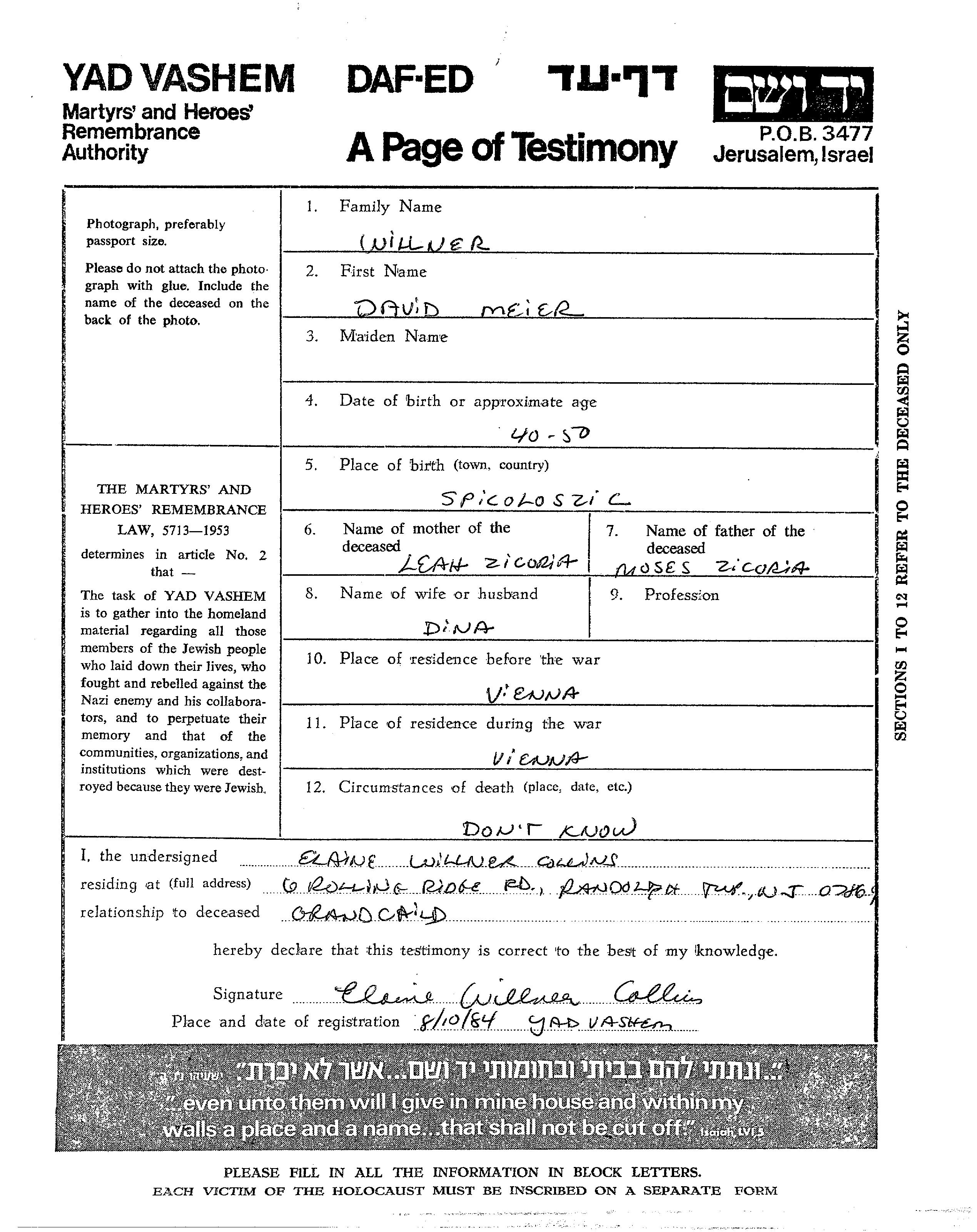 David Meier Willner wurde im Jahr 1883 in Szpikłosy, Polen geboren. Vor dem Zweiten Weltkrieg lebte er in Vienna, Österreich.