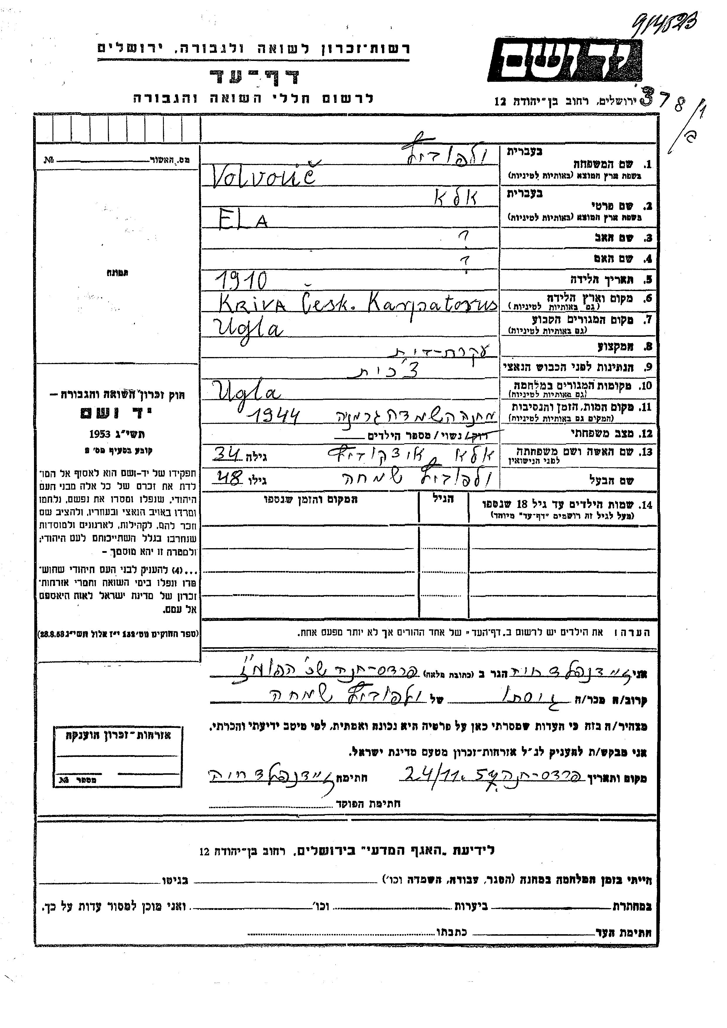 Ela Valfovitz, geb. Itzkovitz wurde im Jahr 1910 in Kriva, Tschechoslowakei geboren. Sie war Hausfrau und mit Simkha Verheiratet. Vor dem Zweiten Weltkrieg lebte sie in Ugla, Tschechoslowakei. Während des Krieges war sie in Ugla, Tschechoslowakei.