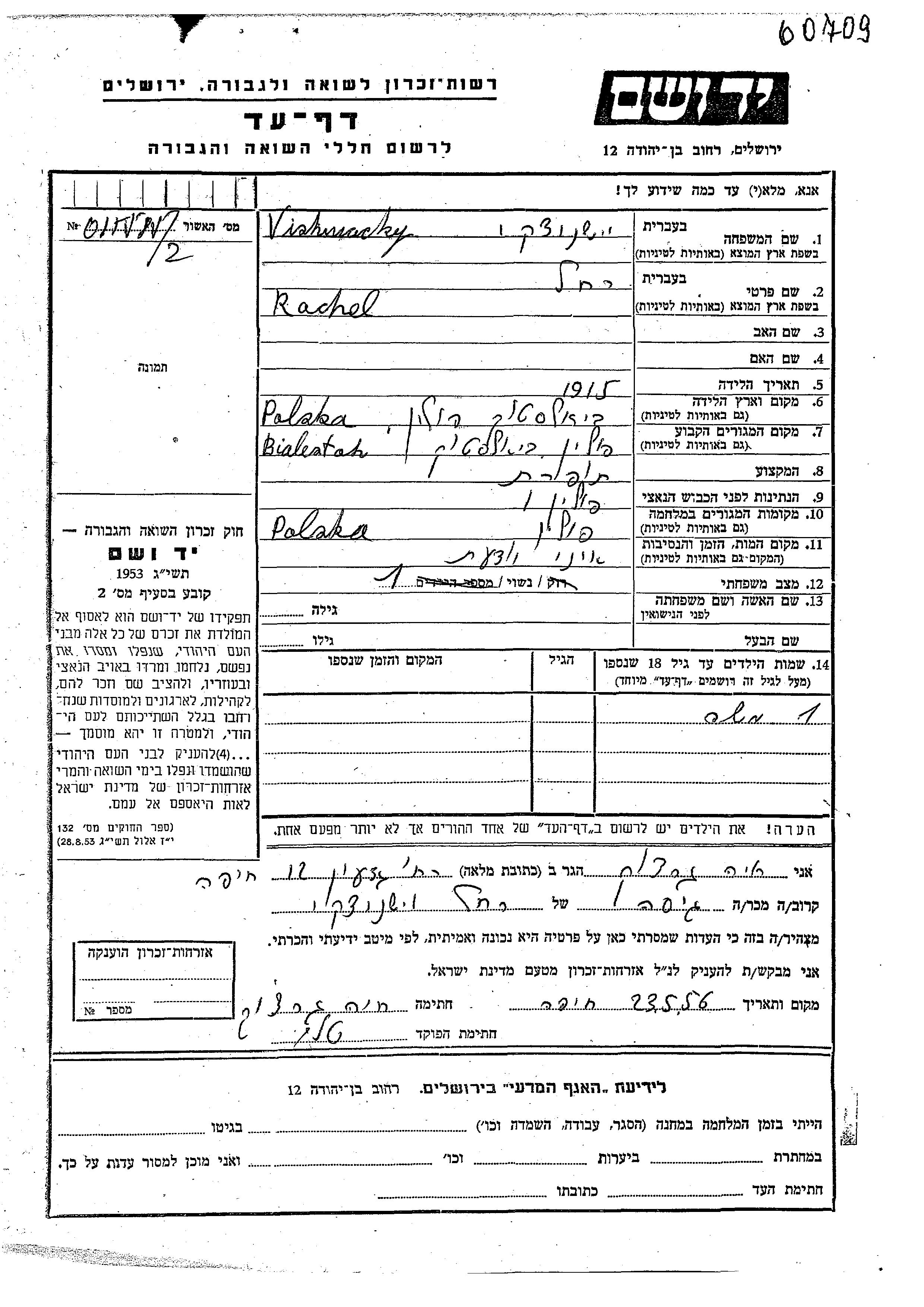 Rachel Vishniacky Vishnitzki wurde im Jahr 1915 in Bialystok, Polen geboren. Sie war Schneiderin und Verheiratet. Vor dem Zweiten Weltkrieg lebte sie in Bialystok, Polen. Während des Krieges war sie in Polen.